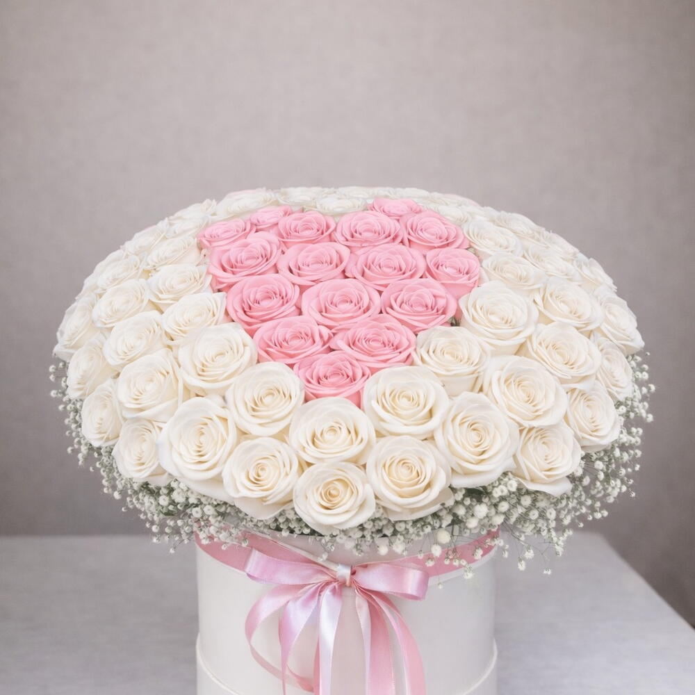 rosas rosadas - 18 шт. белые розы - 25 шт. белая цветочная коробка - 1 шт.