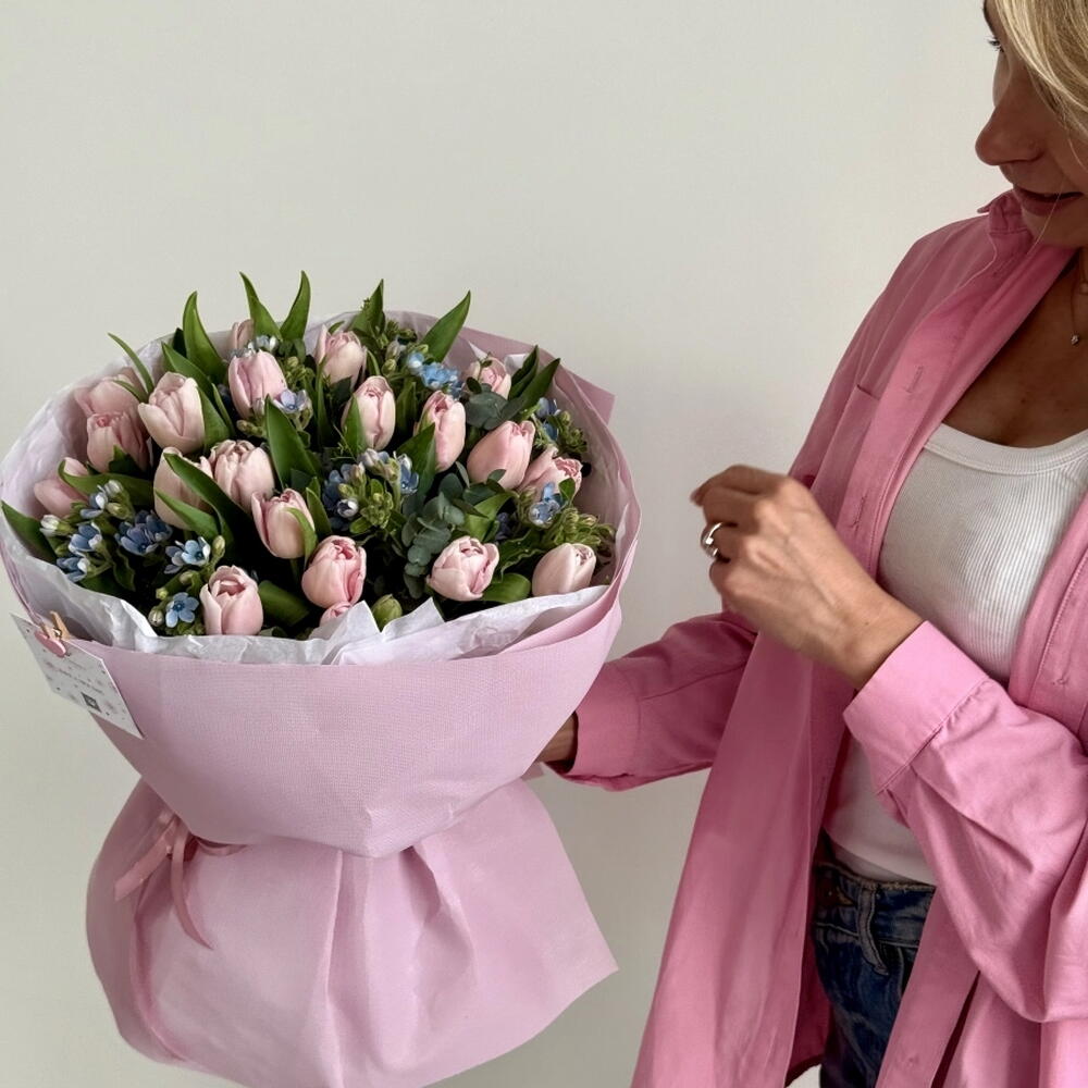 В состав букета входят тюльпаны премиального качества, отобранные флористами для достижения гармоничного сочетания цветов и форм. Доступные для заказа размеры: Малый (11), Средний (17) и Большой (21). Букет упакован в стильную упаковку, подчёркивающую его элегантность. Аккуратная лента завершает композицию, придавая ей завершённый и праздничный вид.