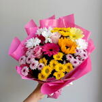 Этот элегантный дизайнерский букет состоит из деликатно подобранных цветов. В его состав включены две яркие герберы, две розы мягкого оттенка, чтобы добавить романтический штрих, лучезарный подсолнух, который является главным героем этого ансамбля, и шесть хризантем, придающих объём и текстуру композиции. Каждый элемент был тщательно отобран, чтобы достичь идеального сочетания стилей и оттенков. Этот букет идеально подходит, чтобы скрасить любое пространство или подарить по особому случаю.