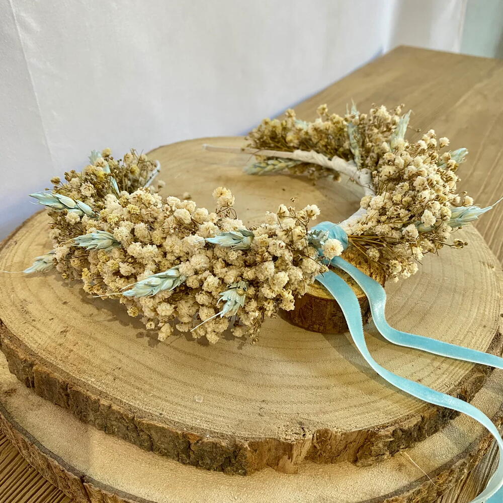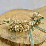 Брошь в форме полумесяца, изготовленная из сушеной гипсофилы и стабилизированной лаванды, украшена подходящим бархатным бантом. Доступна в различных цветах: белый, кремовый, розовый, лиловый, светло-голубой и цвет морской волны. Длина около 17 см