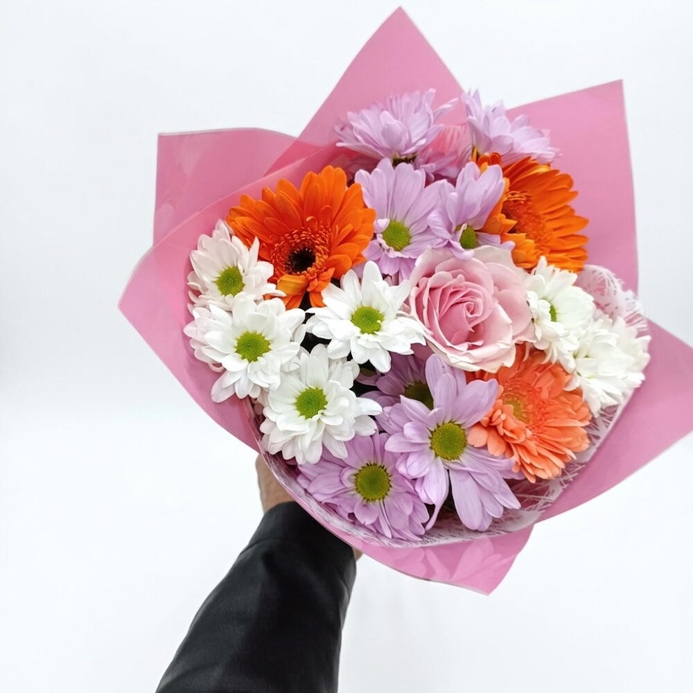 розовая роза - 1 шт. белые ромашки - 2 шт. декоративная упаковка - 3 шт. лиловая маргаритка - 2 шт. Оранжевые герберы - 3 шт.
