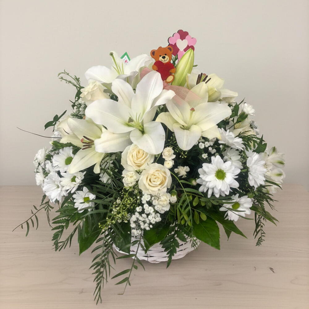 Этот элегантный букет излучает спокойствие, нежность и естественную гармонию. Белые лилии являются центром композиции и символизируют чистоту, мир и добрые пожелания. Белые розы придают мягкость и классическую нотку, полную нежности. Ромашки добавляют свежести и создают радостное и светлое ощущение. Гипсофила окутывает композицию лёгкостью и романтичностью. Зелёная листва подчёркивает каждый цветок и придаёт объём и баланс. Это идеальная композиция для поздравления с рождением, в знак благодарности или чтобы элегантно выразить искреннюю нежность.