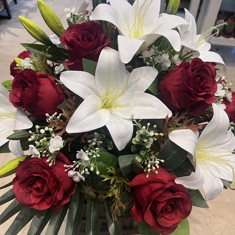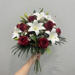 rosas rojas - 8 шт. разнообразная зелень - 5 шт. 6 красных роз, 2 белые ориентальные лилии и разнообразная зелень - 6 шт. белые ориентальные - 2 шт.