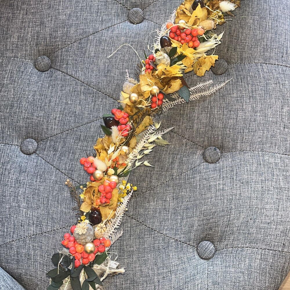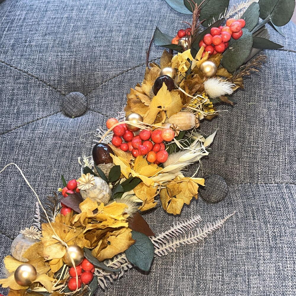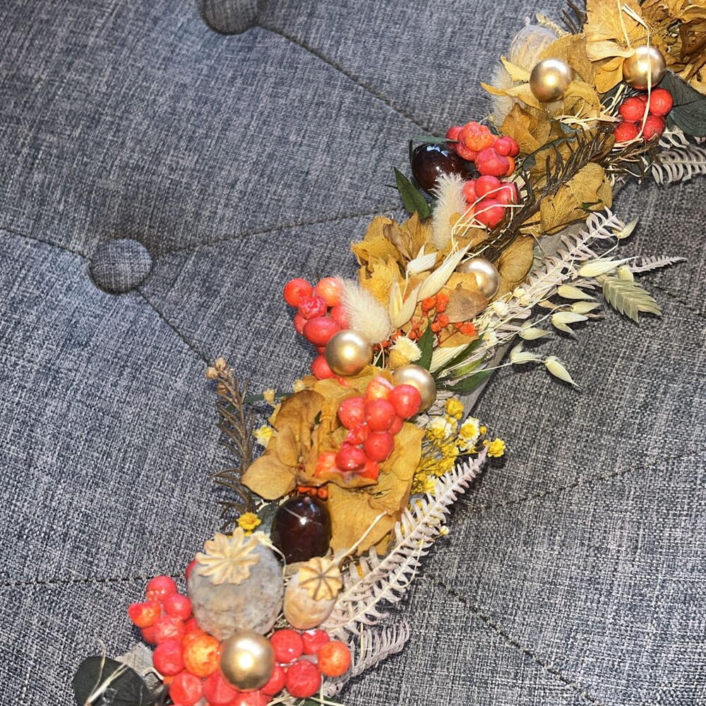 жёлтый сухой лист - 20 шт. искусственные ягоды - 10 шт. декоративные золотые ягоды - 6 шт. декоративные тёмные ягоды - 4 шт. консервированные зелёные листья - 10 шт. листья бордовая окантовка - 10 шт. сухие стебли овса - 8 шт. сухие маковые коробочки - 2 шт. сухой бежевый папоротник - 4 шт. деревянная ветка - 1 шт.