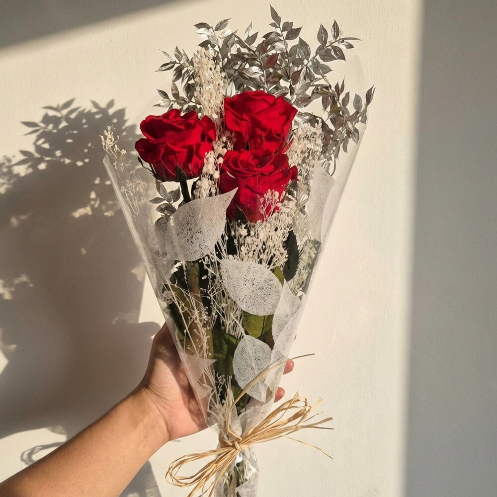 Этот элегантный букет из трёх вечных стабилизированных красных роз — изысканное выражение любви, страсти и длительного восхищения. Стабилизированные розы сохраняют свою природную красоту в течение многих лет без необходимости в воде и уходе, в то время как белая гипсофила и серебристый рускус придают изделию нежный и современный стиль. Мягкий аромат и утончённая подача делают этот букет идеальным подарком на годовщины, День святого Валентина, романтические торжества или для элегантного декора дома и офиса.