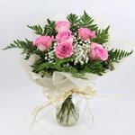 Букет из 6 розовых роз с гипсофилой и зеленью