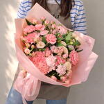 Un exuberante ramo en delicados tonos rosados que irradia romanticismo y suavidad. La combinación de claveles y pequeñas rosas crea una composición rica en texturas y matices, llena de encanto visual. Cada flor aporta una sensación de ternura y frescura, evocando emociones cálidas y sinceras. El envoltorio en papel rosa pastel realza la elegancia del arreglo y le da un toque moderno. Es una elección perfecta para expresar amor, gratitud o admiración. Ideal para cumpleaños, aniversarios o simplemente para sorprender sin motivo. Un bouquet que habla de cariño en cada pétalo.