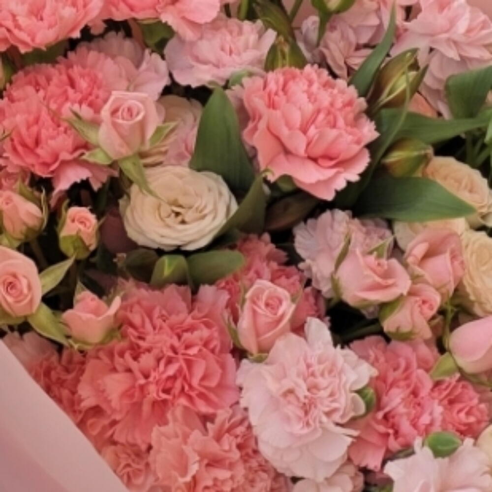 Un exuberante ramo en delicados tonos rosados que irradia romanticismo y suavidad. La combinación de claveles y pequeñas rosas crea una composición rica en texturas y matices, llena de encanto visual. Cada flor aporta una sensación de ternura y frescura, evocando emociones cálidas y sinceras. El envoltorio en papel rosa pastel realza la elegancia del arreglo y le da un toque moderno. Es una elección perfecta para expresar amor, gratitud o admiración. Ideal para cumpleaños, aniversarios o simplemente para sorprender sin motivo. Un bouquet que habla de cariño en cada pétalo.