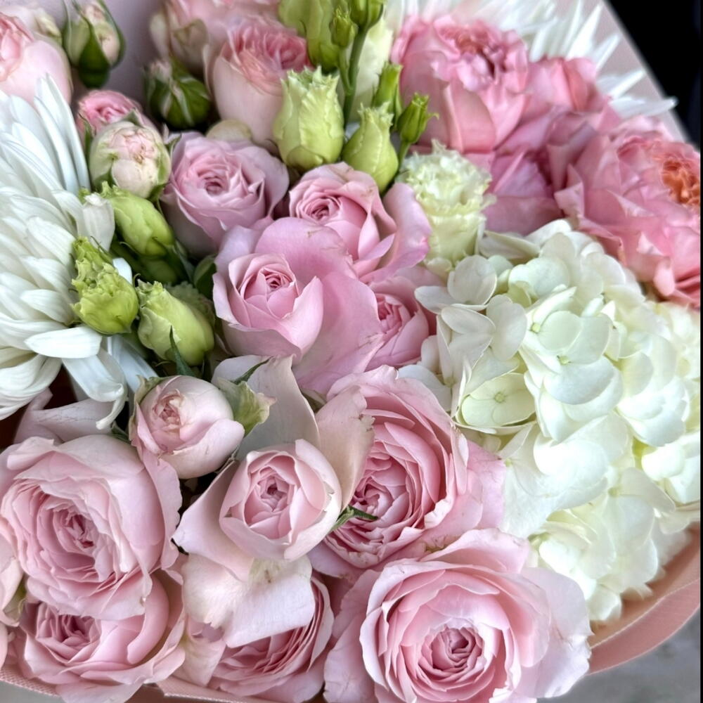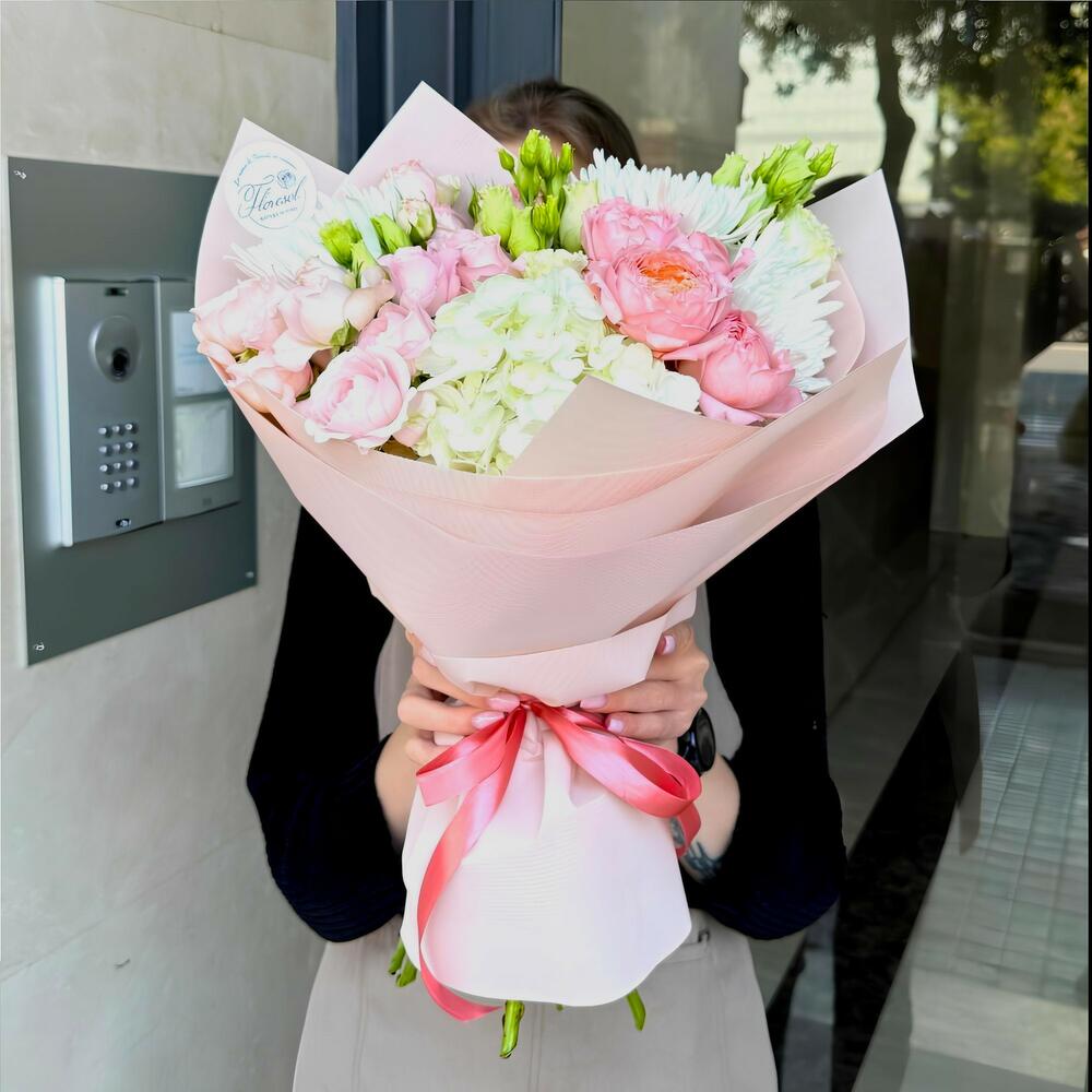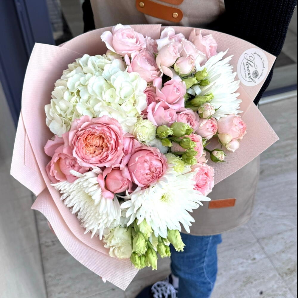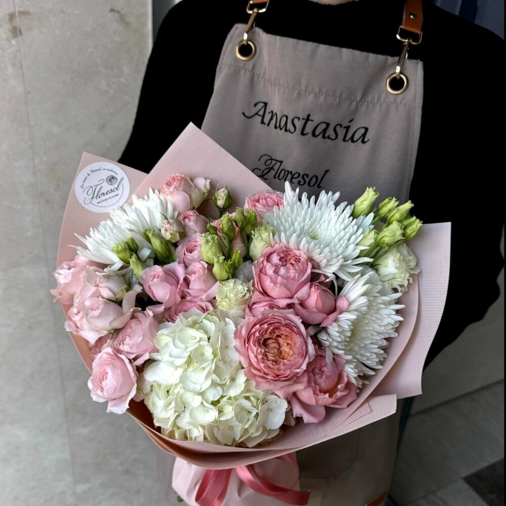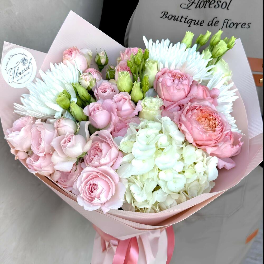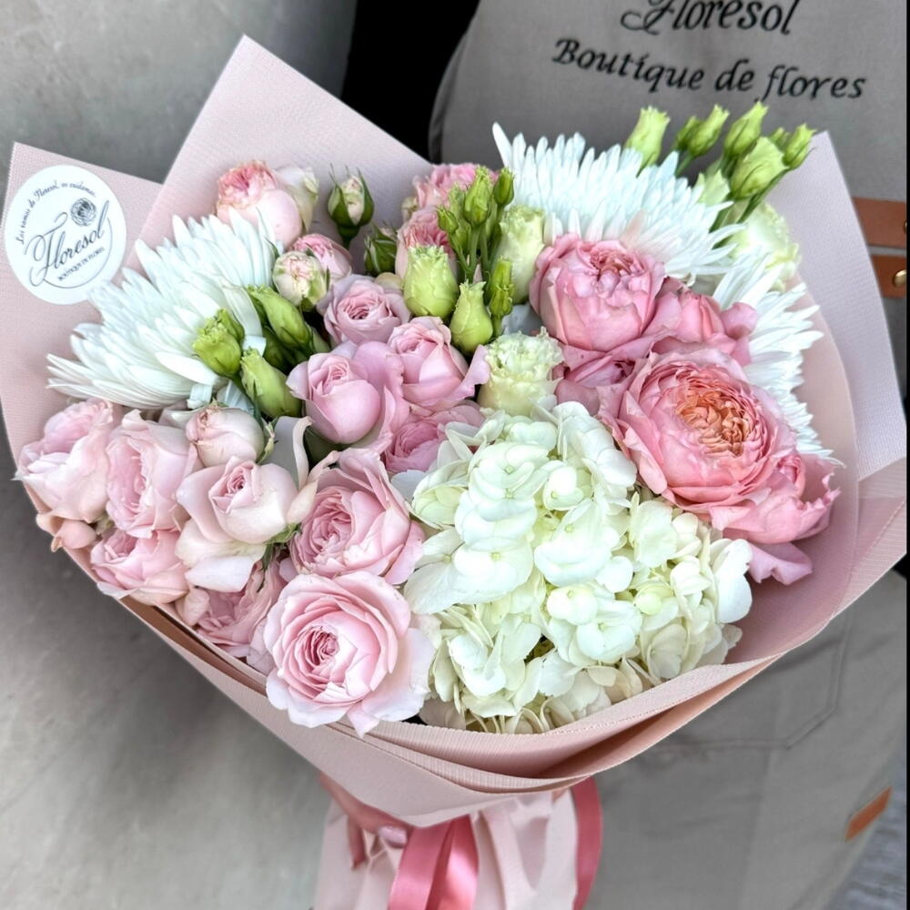 hortensia - 1 шт. Lisianthus - 2 шт. rosa ramificada - 3 шт. hrizantema - 3 шт. rosa djulieta - 1 шт.