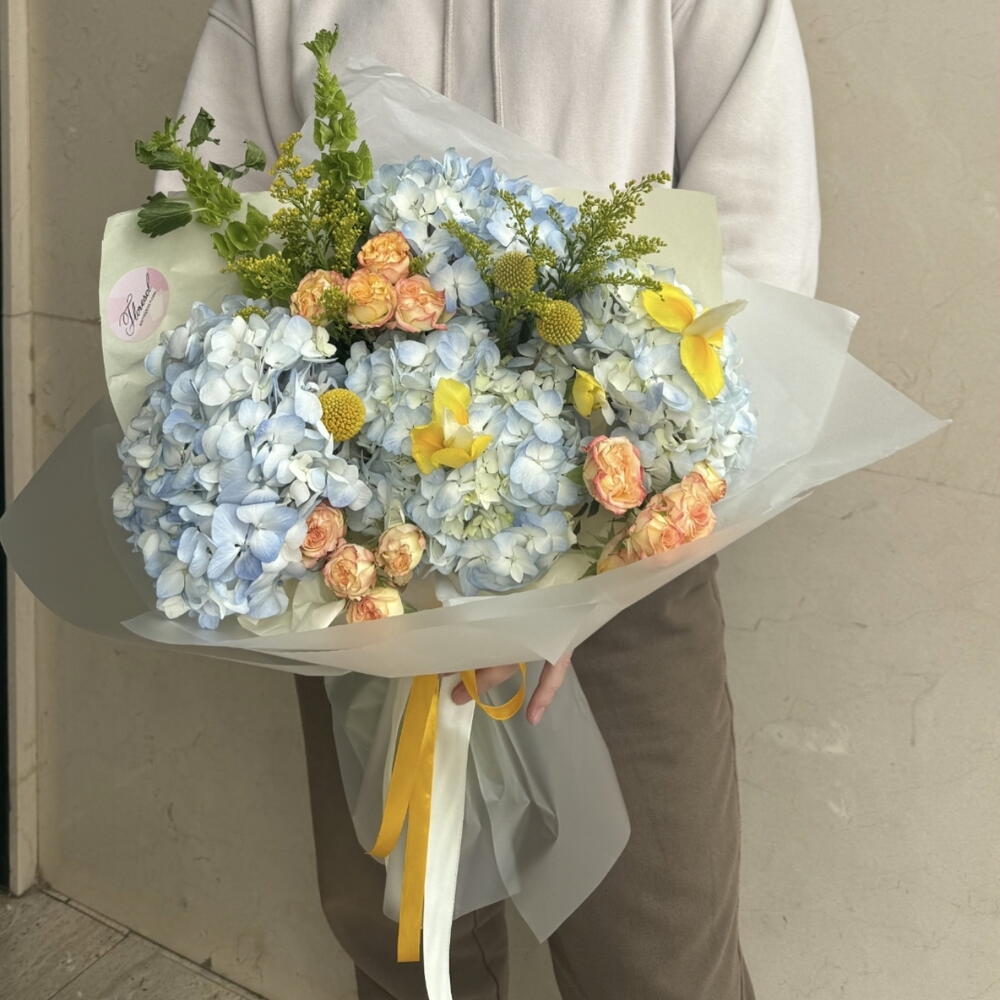 Solidago - 2 шт. Iris - 3 шт. hortensia - 4 шт. kraspediya - 3 шт. rosa - 4 шт. moluccella - 1 шт.