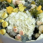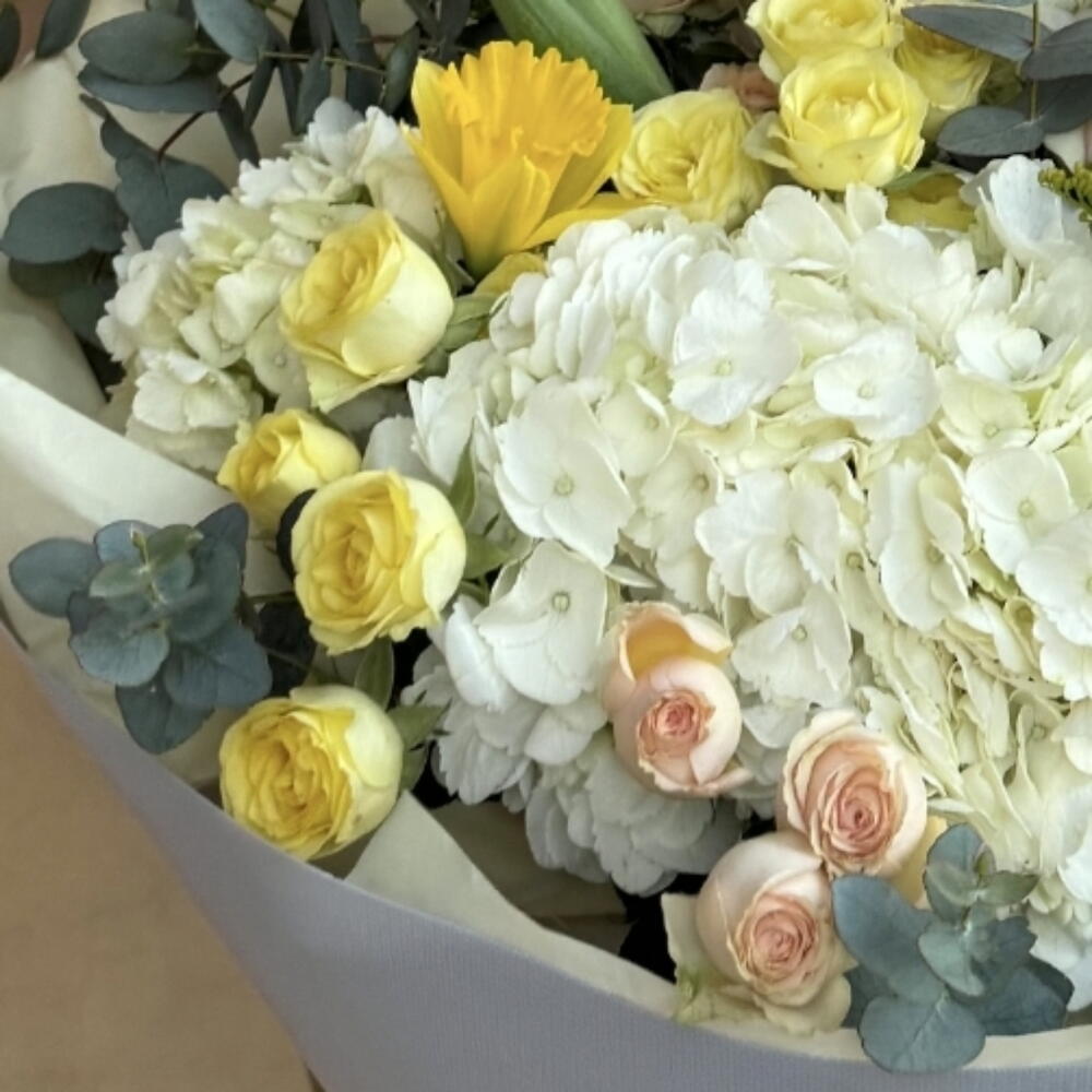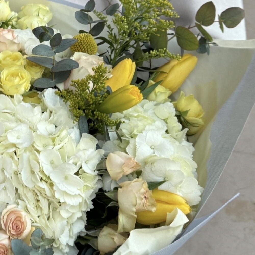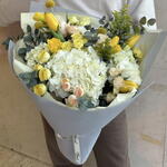 Eucalyptus - 2 шт. Tulips - 5 шт. Solidago - 3 шт. hortensia - 6 шт. kraspediya - 3 шт. narcissus - 4 шт. rosas - 5 шт.