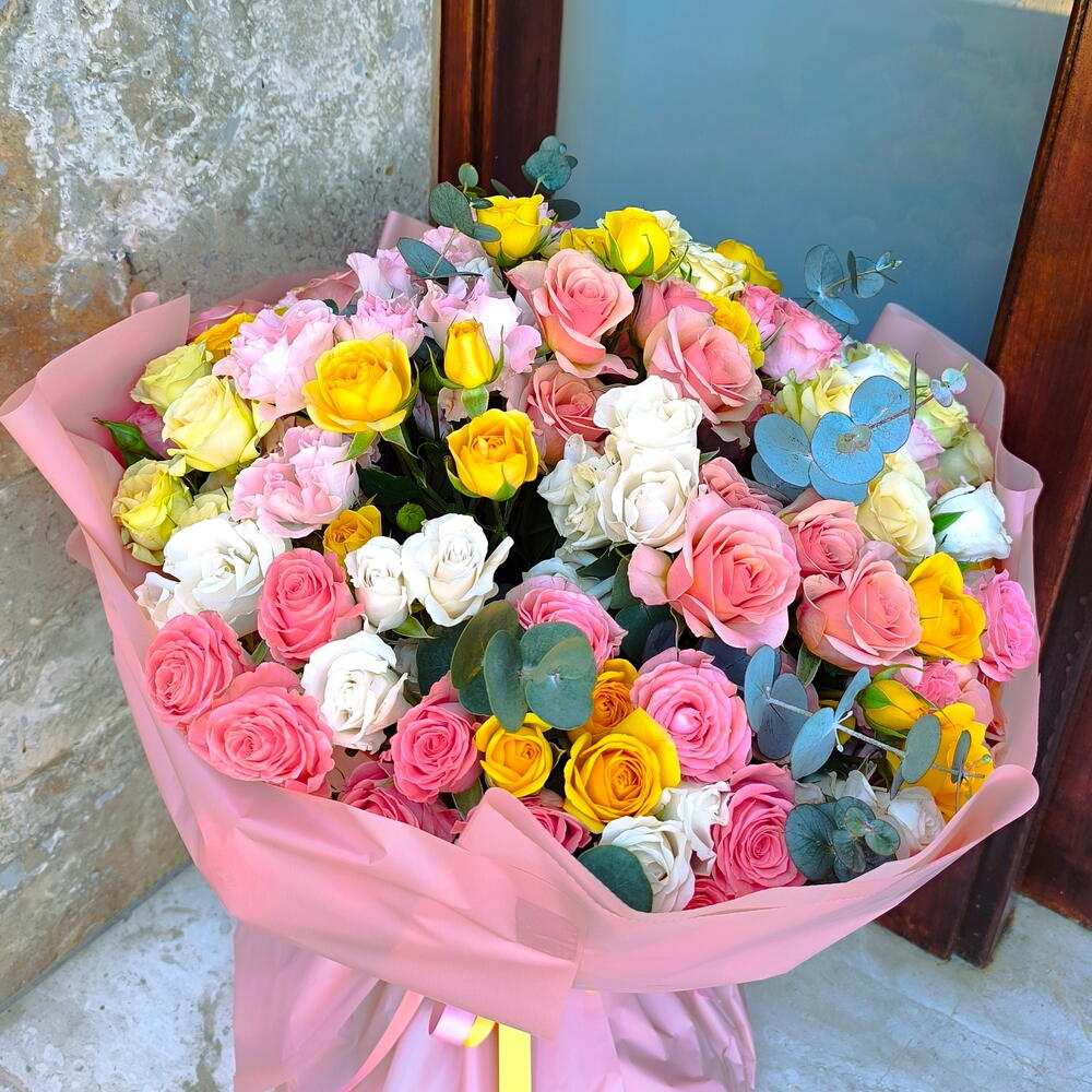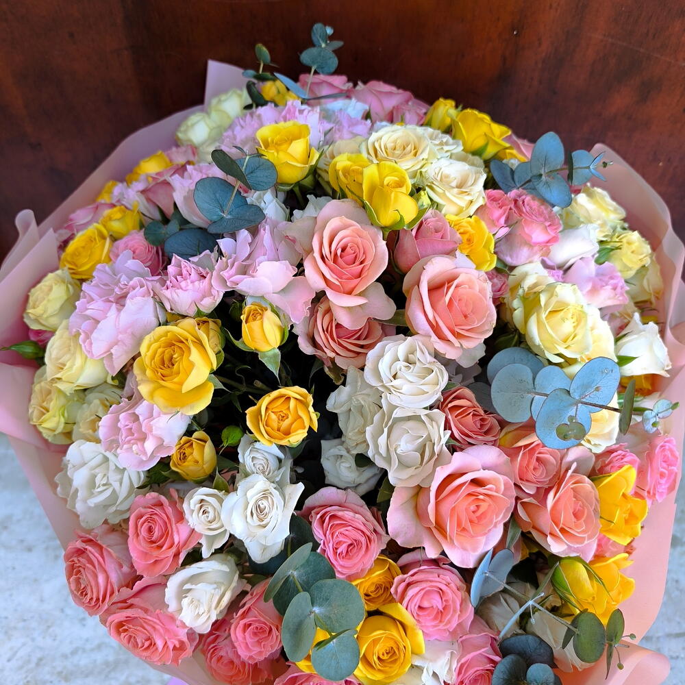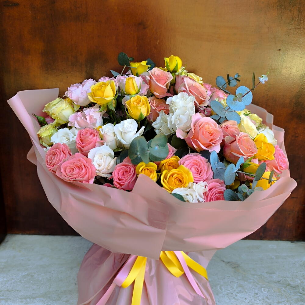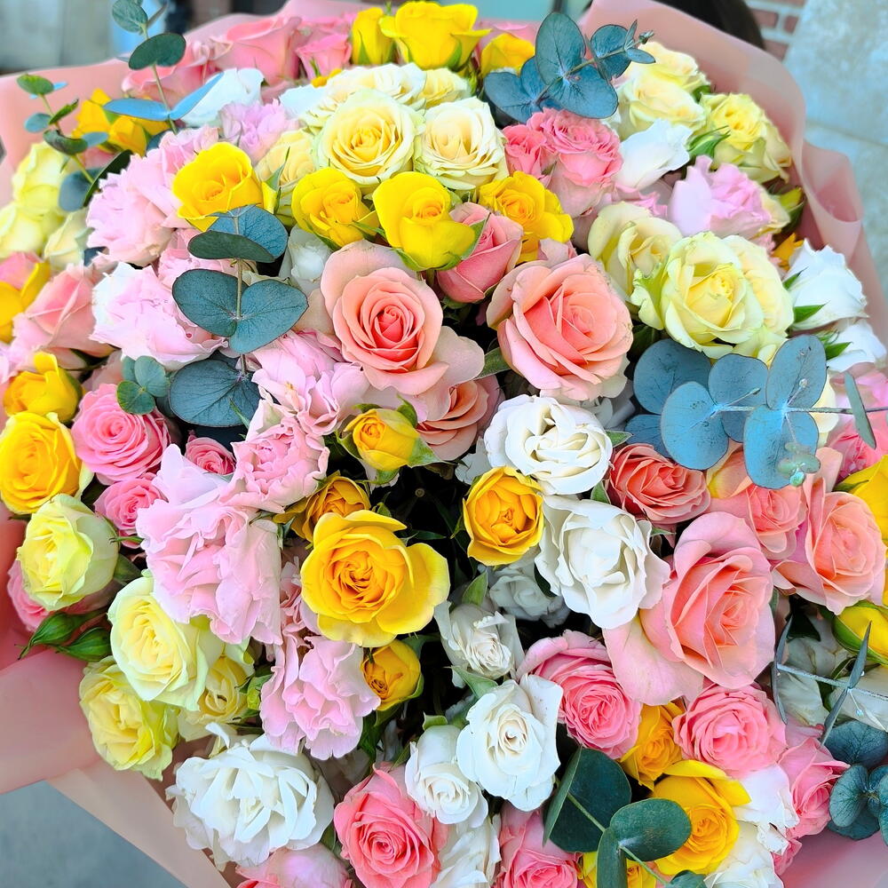 eucalyptus cinerea - 10 шт. cintas - 2 шт. rosas ramificadas blancas - 10 шт. papel de regalo - 5 шт. rosas ramificadas amarillas - 10 шт. rosas ramificadas rosas - 20 шт. rosas ramificadas melocoton - 10 шт.