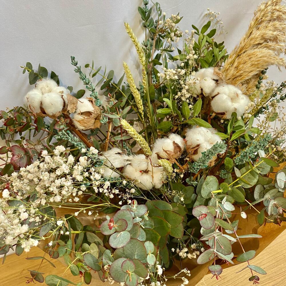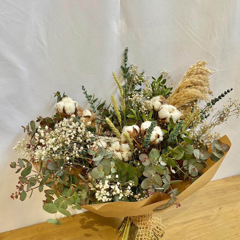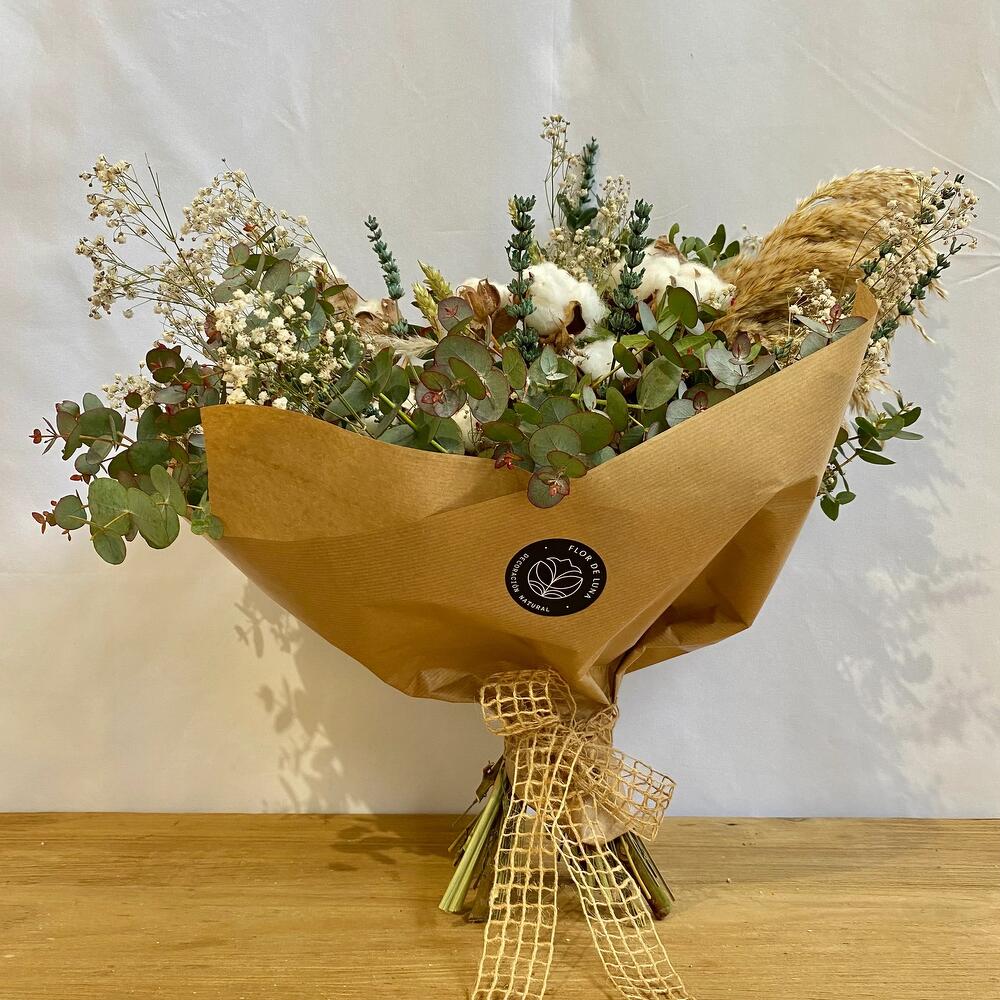 Букет сухих цветов, состоящий из лентиска, эвкалипта цинерея, белой паникулаты, цветка хлопка, пшеницы, пампасной травы и синей лаванды. Размеры букета 50 см в диаметре и 60 см в высоту.