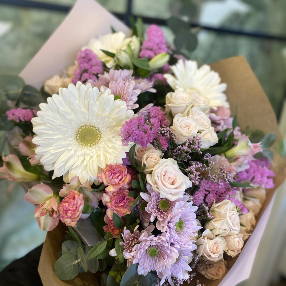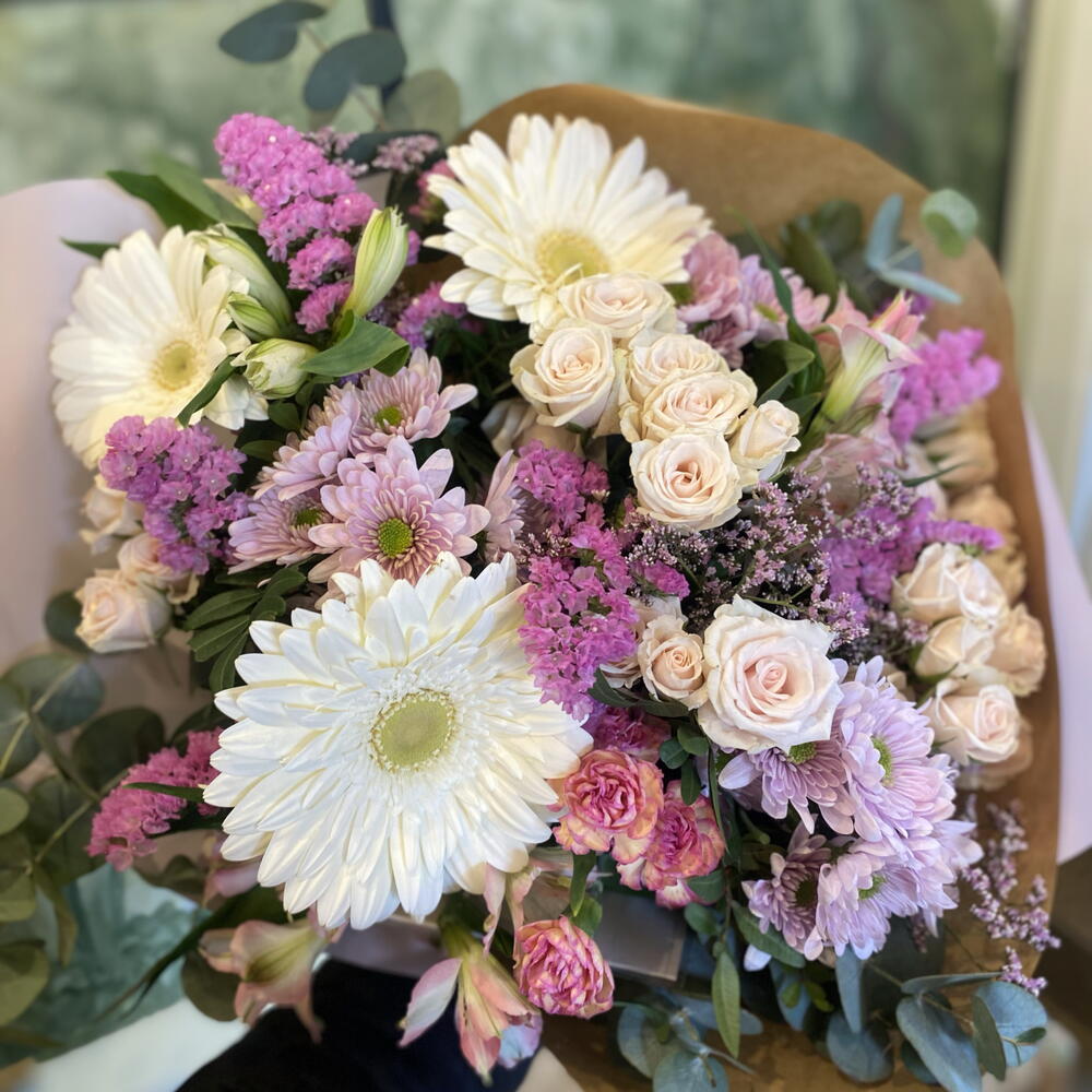 Эта цветочная композиция из нашей коллекции «Особые флористы» великолепно сочетает в себе по три экземпляра экзотической статицы, яркой герберы, нежной розы, очаровательной маргариты, прекрасной клавеллины и пленительных астремерий. Идеально подобранный букет объединяет лучшие дары природы, создавая симфонию красок и ароматов. Идеально подходит для любого случая и гарантированно подарит радость, эта прекрасная композиция воплощает гармоничное взаимодействие флоры в ее самой поразительной форме. Настоящее визуальное наслаждение и чувственное удовольствие, она добавит элегантности и красоты любому помещению.