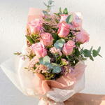 Букет Brigitte из розовых роз – элегантный букет из 8 роз с натуральной зеленью