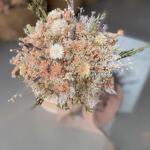 стебли белой гипсофилы - 4 шт. стебли статицы лососевого цвета - 5 шт. веточки натуральной лаванды - 4 шт. белые цветы гелихризума - 4 шт. стебли белого льна - 3 шт. натуральные веточки оксодии - 3 шт. веточки эвкалипта парвифолия - 2 шт.