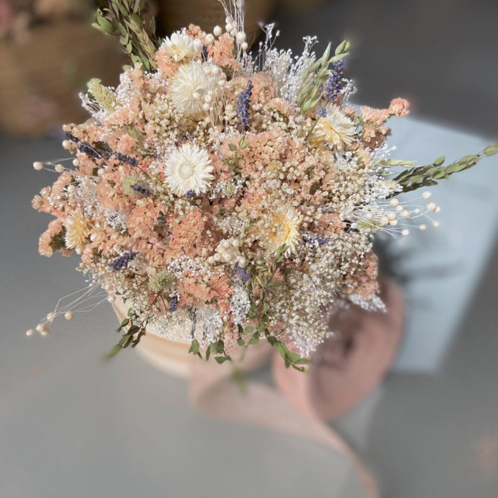 Эта очаровательная композиция из стабилизированных цветов составлена из изысканного набора природных элементов. Она включает пять стеблей статицы нежного лососевого оттенка, подчеркнутых четырьмя веточками лаванды. Четыре стебля белой гипсофилы и четыре белых цветка бессмертника добавляют нотку свежести. Белый лен добавляет мягкости благодаря трем стеблям, а три веточки оксодии придают уникальную текстуру. Наконец, две веточки эвкалипта мелколистного добавляют этой очаровательной композиции жизнерадостный и бодрящий штрих. Эта композиция идеально подходит для любого пространства, где необходимо сохранить прикосновение природы, и станет стильным и элегантным акцентом.