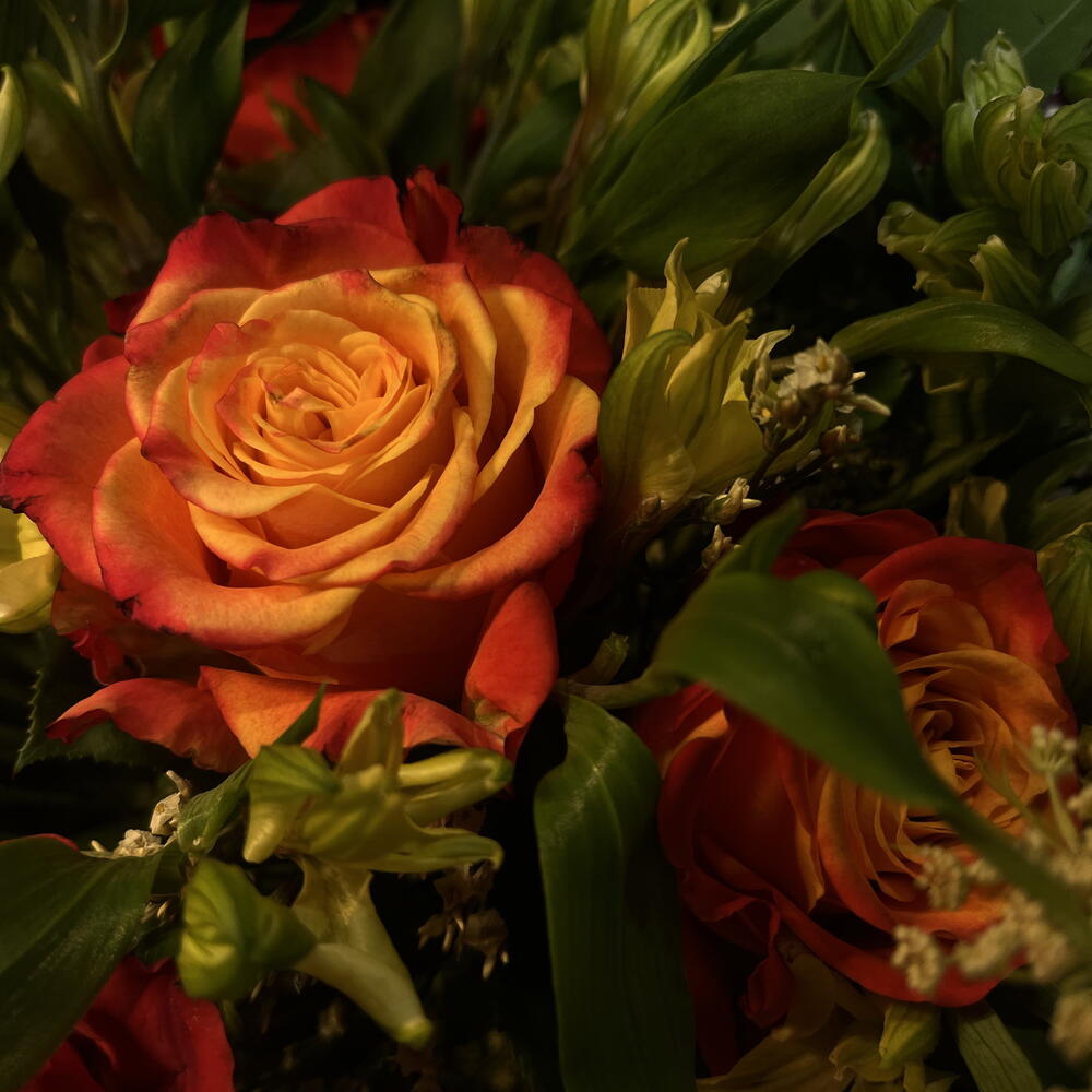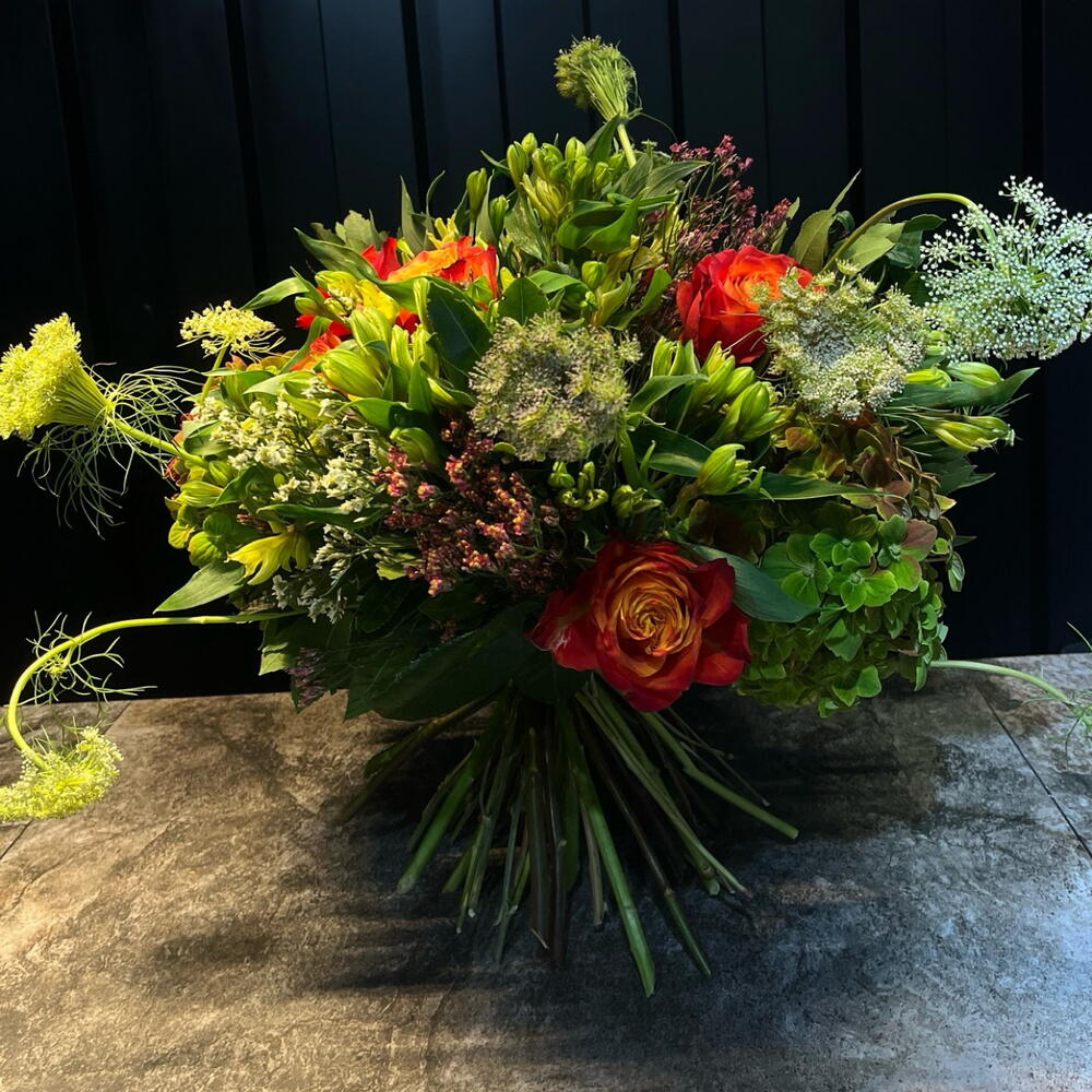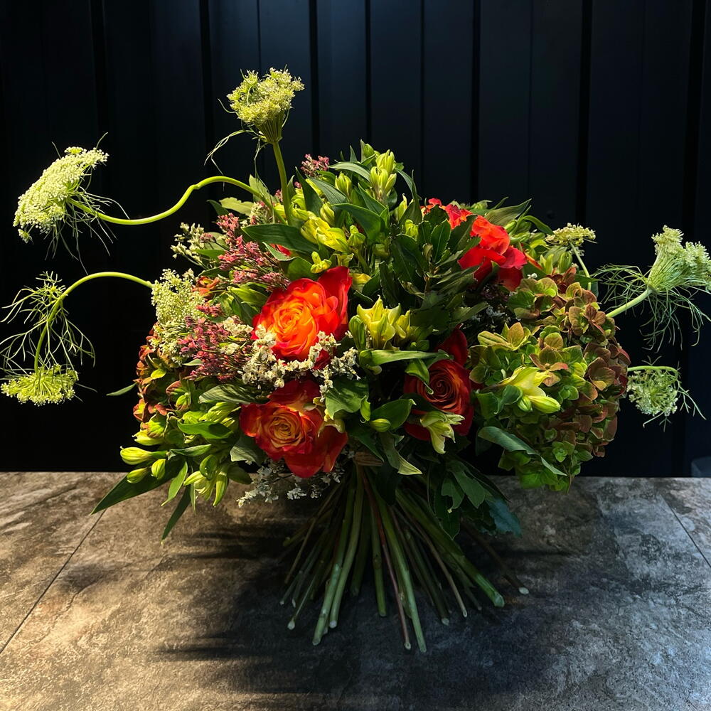 Este encantador arreglo floral de la categoría Ramos clásicos está increíblemente elaborado con 4 unidades de Ammi Majus, dando un toque de salvaje elegancia; 11 unidades de Alstroemeria, añadiendo un sutil y delicado contraste de color; 10 rosas, que agregan una sentida expresión de amor y admiración; 3 unidades de hortensia, aportando un toque romántico y clásico; 7 unidades de Limonium, dando un bello destello de color púrpura intenso y para finalizar, 1 unidad de Marfull, aportando hermosa textura y volumen a este impresionante arreglo. Cada uno de los elementos se mezcla harmoniosamente para ofrecerte un ramo que será recordado por mucho tiempo.