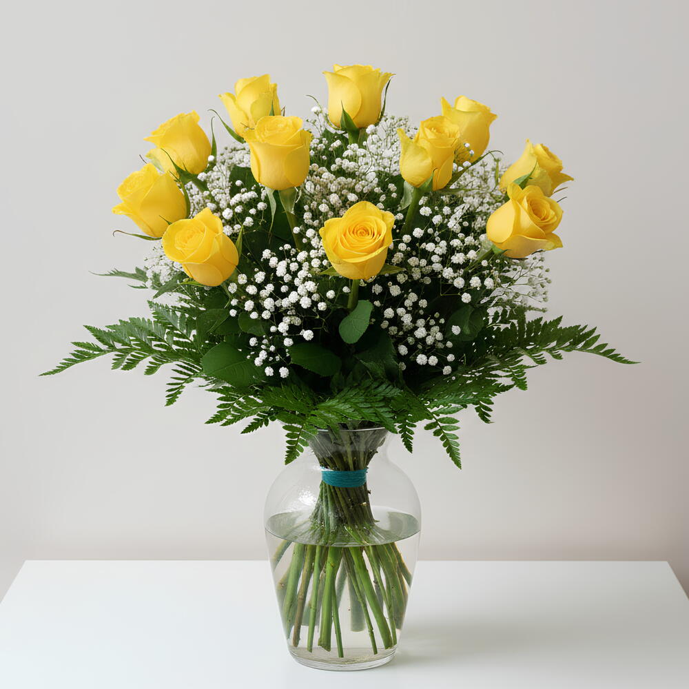 Gypsophila - 5 шт. rosas amarillas - 12 шт. helecho de cuero - 6 шт.