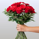rosas rojas - 18 шт. папоротник - 4 шт. белая гипсофила - 2 шт.