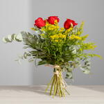 Классический букет, который излучает страсть, энергию и естественную элегантность. Яркие красные розы сочетаются с деликатными веточками эвкалипта и жёлтыми цветами солидаго, создавая идеальную гармонию цвета и фактуры. Его свежий и современный стиль делает его идеальным подарком, чтобы выразить любовь или искреннее восхищение. Каждая деталь тщательно расположена, чтобы подчеркнуть красоту цветов в их самой чистой форме. Рустикальная джутовая лента придаёт ремесленный и натуральный штрих. Композиция, полная жизни, передаёт сильные эмоции и вневременную красоту.