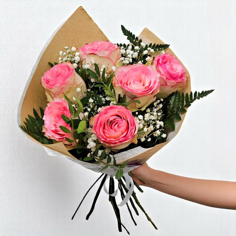 gipsofila - 3 шт. rosas rosadas - 6 шт. разнообразная зелень - 5 шт.