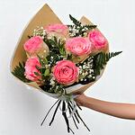 Этот прекрасный букет насыщенно-розовых роз, дополненный нежной гипсофилой и свежей зеленью, — идеальный подарок для ваших близких. Упаковка из крафт-бумаги подчеркивает природную красоту цветов, создавая атмосферу тепла и элегантности.