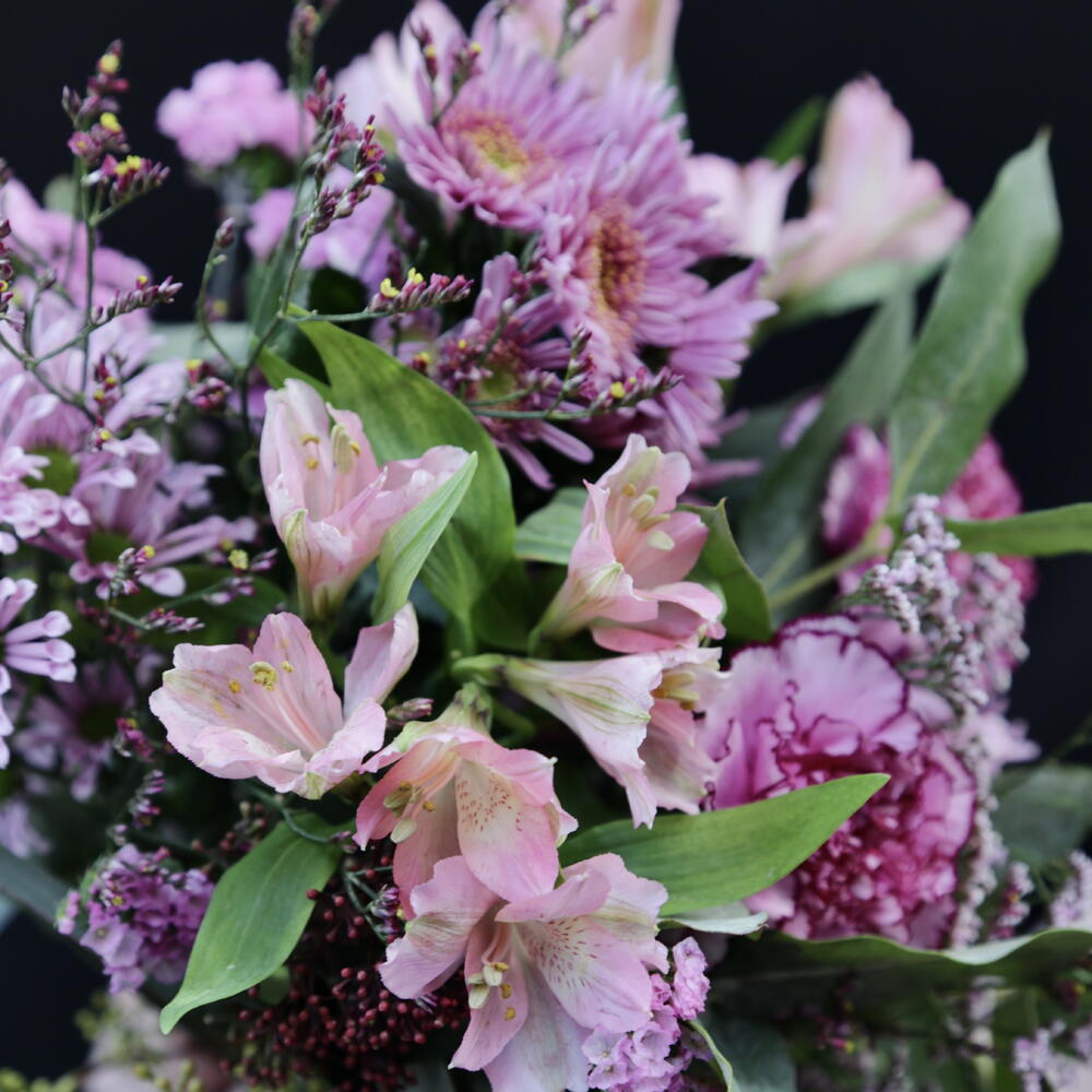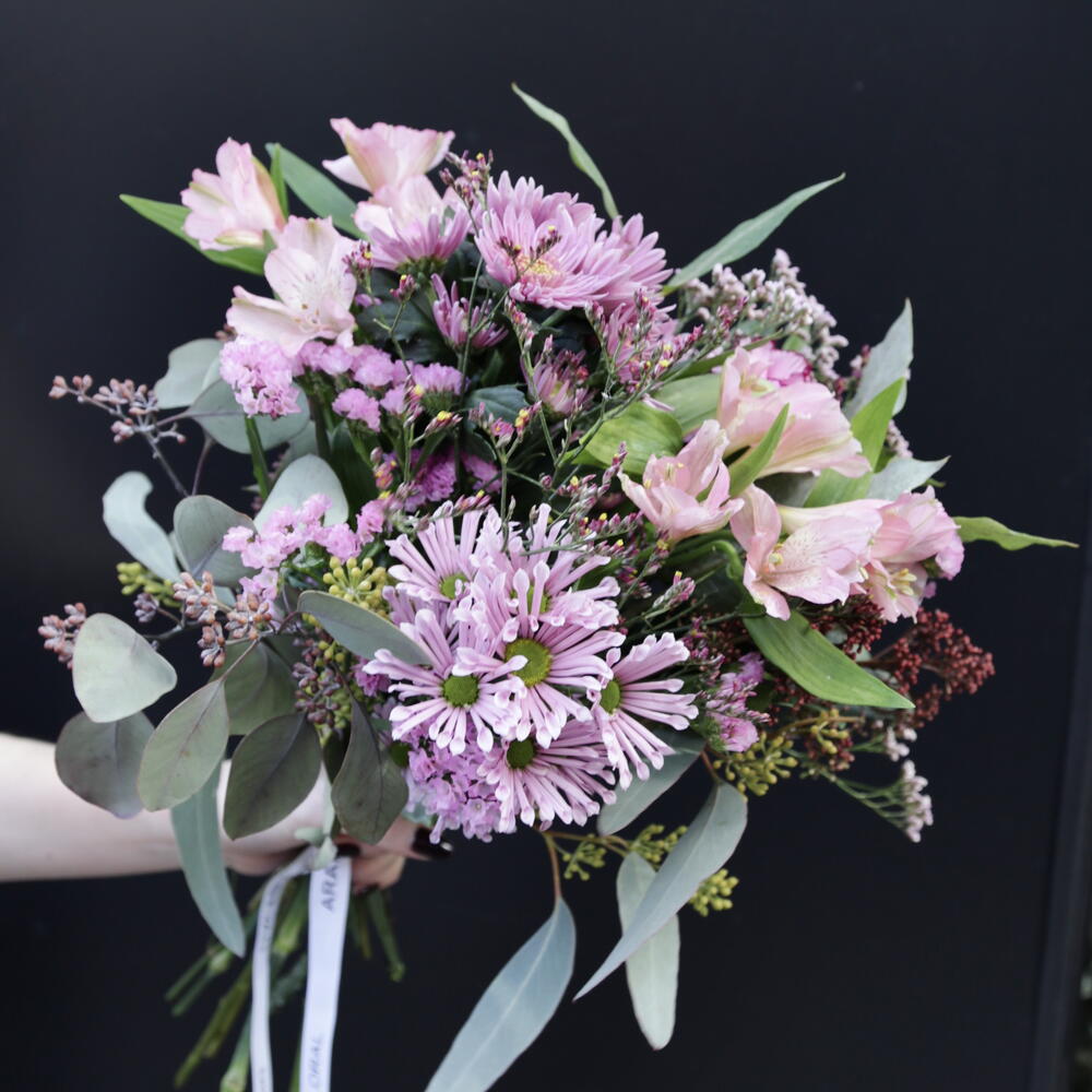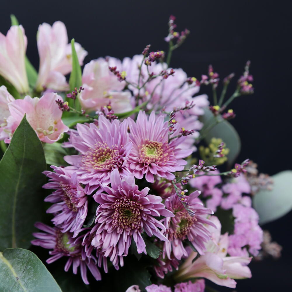 Statice - 2 шт. Limonium - 2 шт. Alstroemeria - 2 шт. skimmia - 2 шт. eucalipto - 3 шт. crisantemo - 2 шт. clavel - 2 шт.