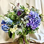 eucalipto - 6 шт. статица лиловая - 3 шт. разнообразная зелень - 7 шт. синий дельфиниум - 4 шт. синий мордовник (eryngium) - 4 шт. кремовый лизиантус - 5 шт. синие и лиловые гортензии - 3 шт.