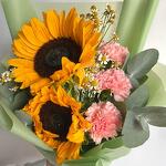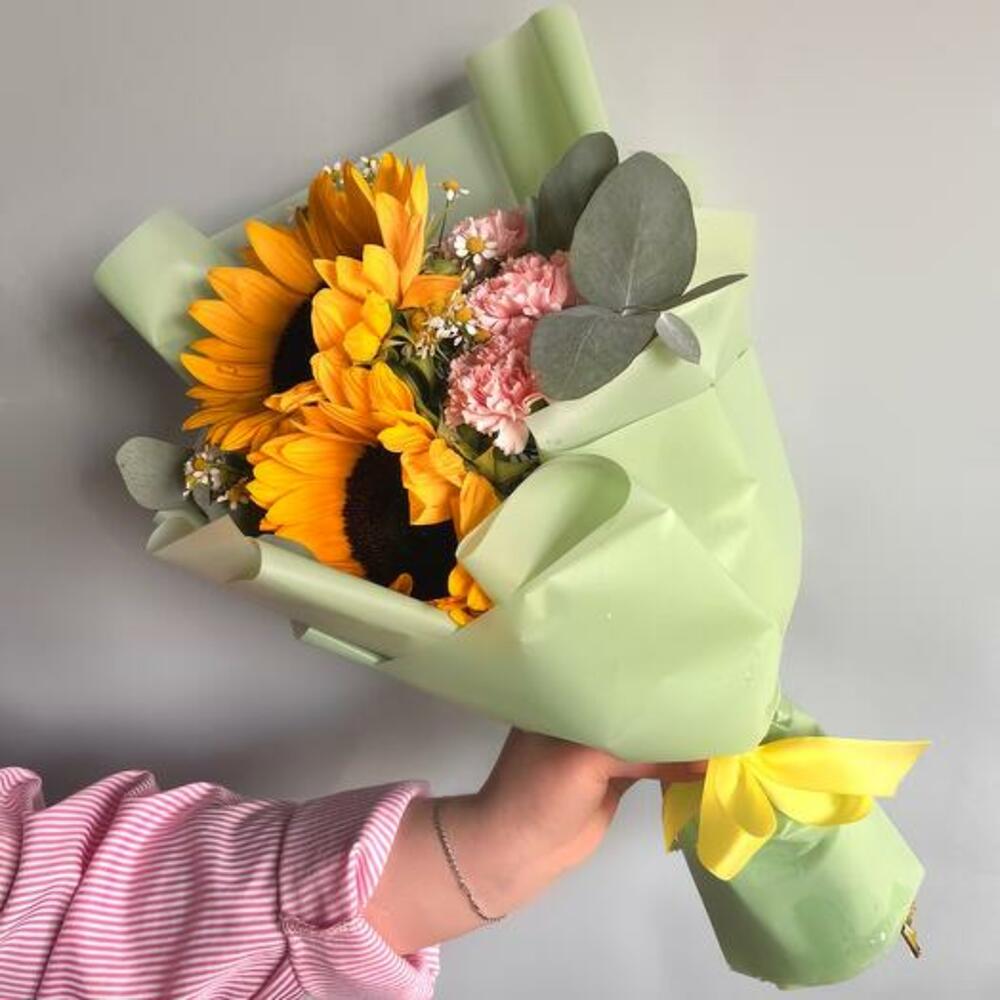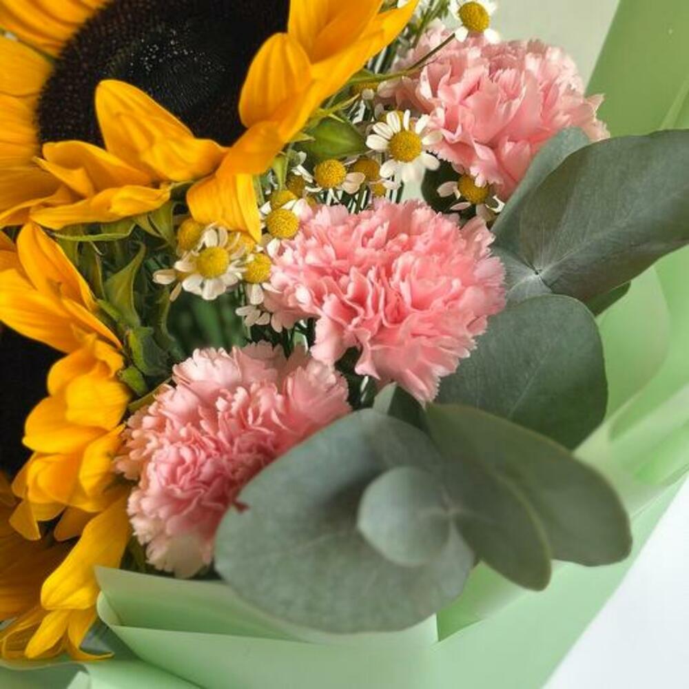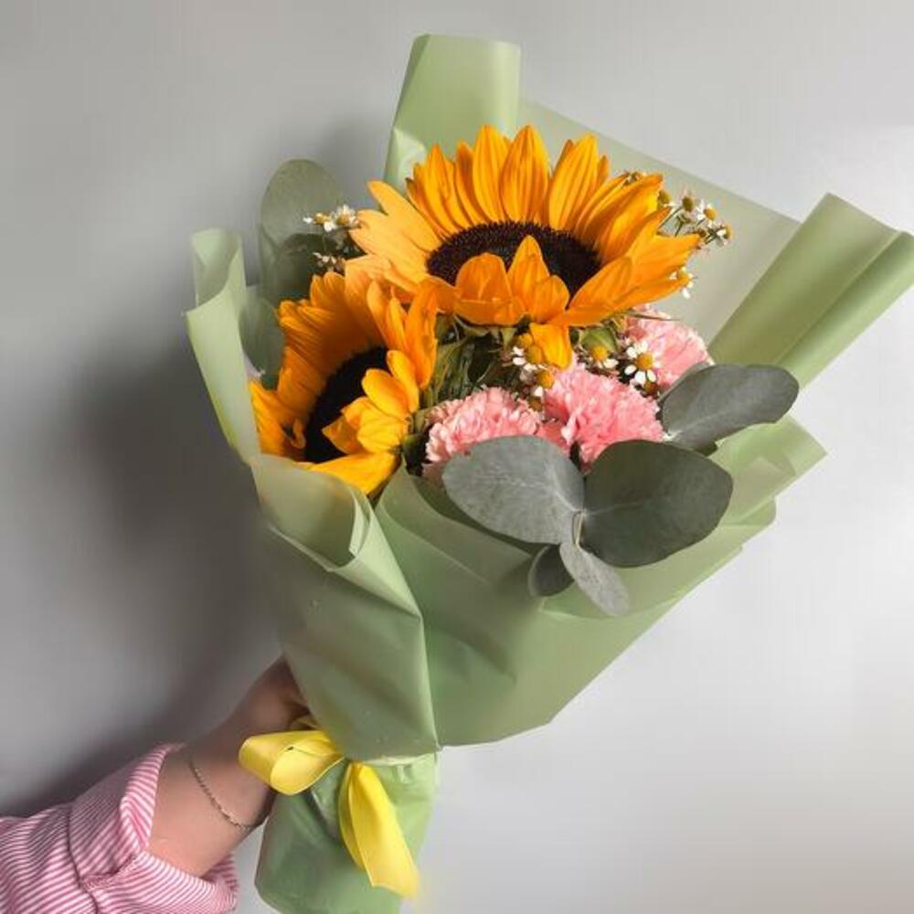 Наш букет — уникальное творение, созданное, чтобы удивлять и очаровывать. С сияющими подсолнухами, нежными розовыми гвоздиками и жизнерадостными ромашками этот букет — идеальное дополнение к любому случаю. Игривое сочетание цветов и фактур вызывает ощущение тепла и радости, превращая его в идеальный подарок, чтобы скрасить чей-то день. Сделанный вручную с любовью, этот букет доставляется красиво оформленным, готов дарить улыбки и солнечные лучи.