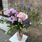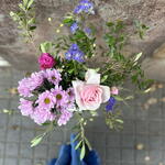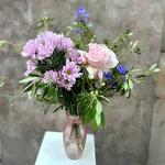 delfinium - 3 шт. пион - 2 шт. хризантемы - 1 шт. пастельно-розовый - 1 шт. олива (тонкая ветка с удлинёнными листьями) - 3 шт.