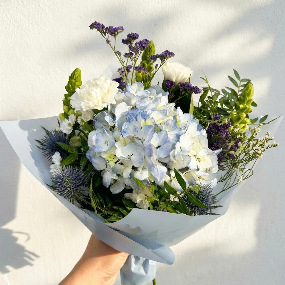 hortensia - 1 шт. claveles - 4 шт. разнообразная зелень - 2 шт. дополняющие цветы - 4 шт.