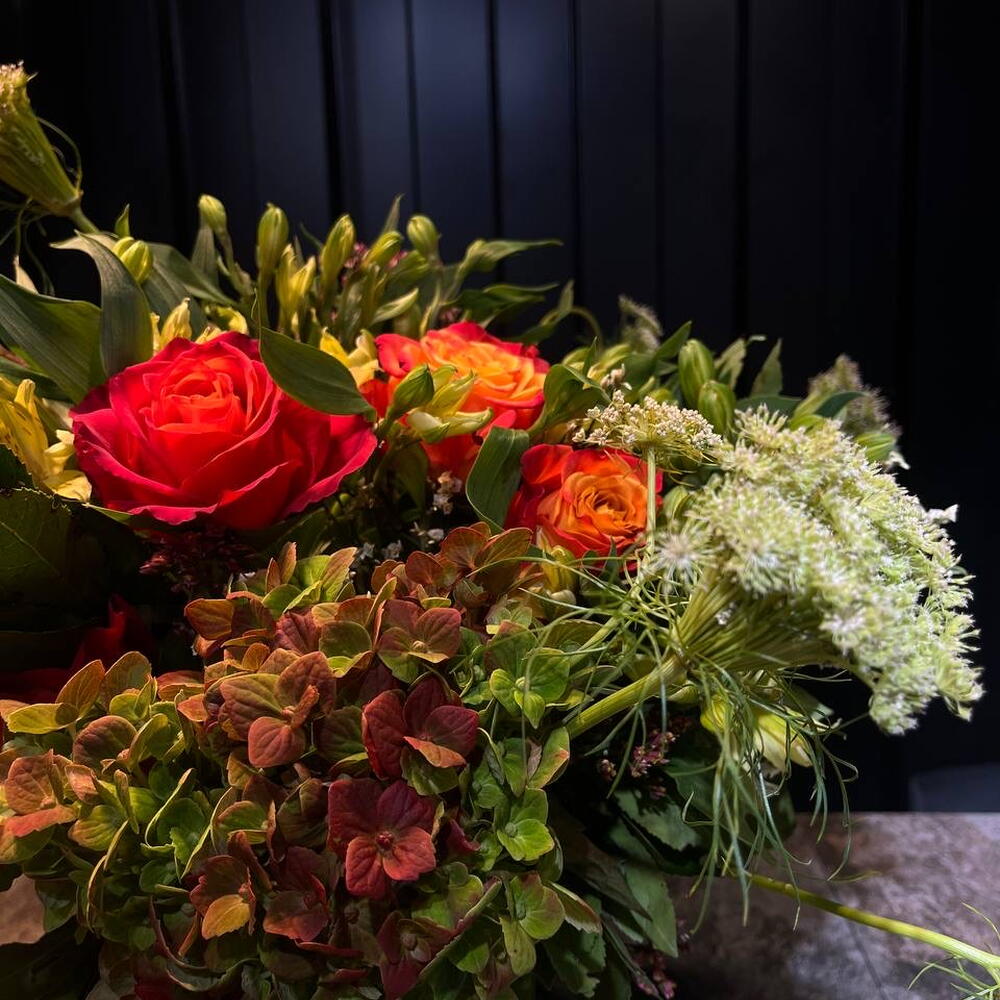 Limonium - 7 шт. Alstroemeria - 11 шт. hortensia - 3 шт. rosas - 10 шт. ammi majus - 4 шт. marful - 1 шт.