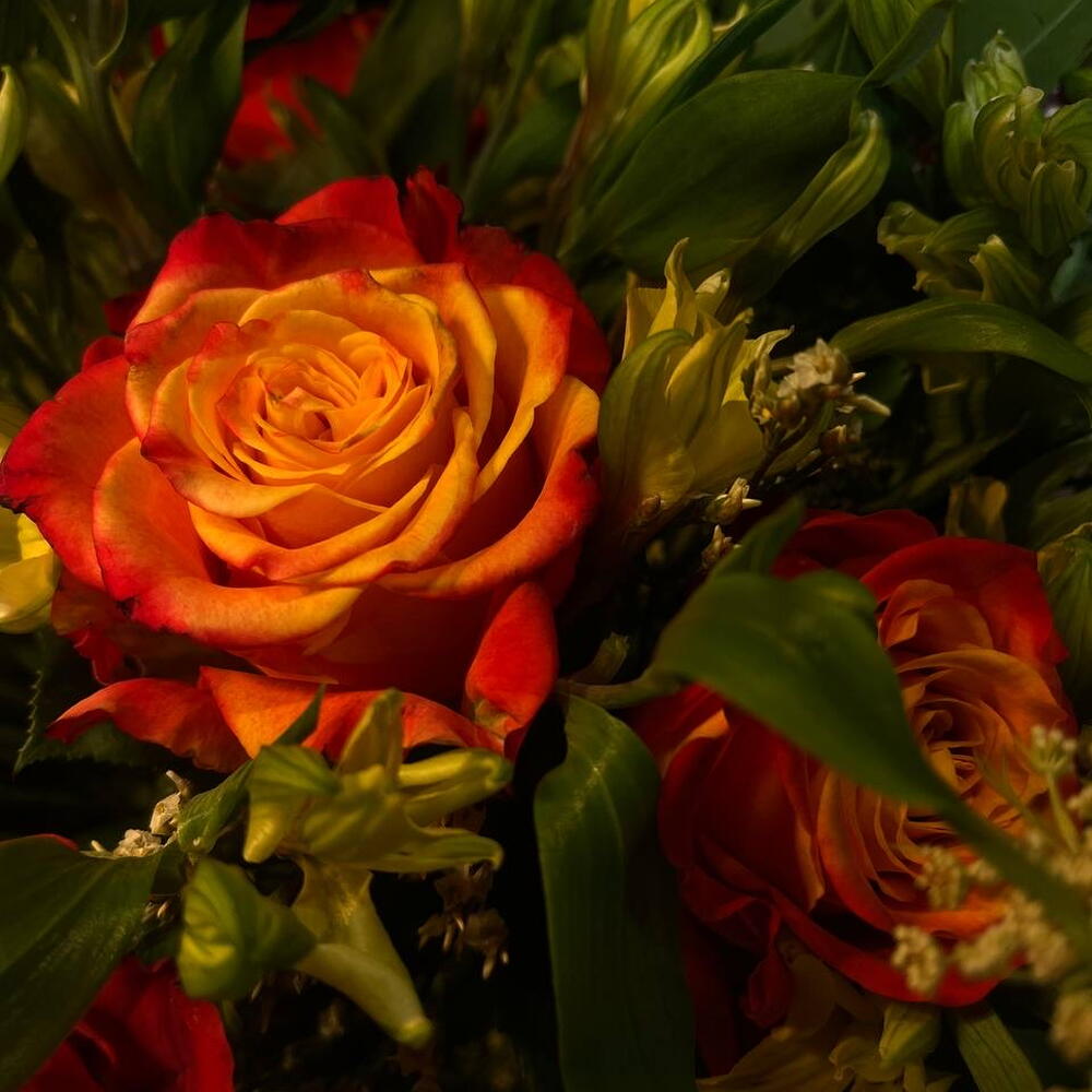 Este encantador arreglo floral de la categoría Ramos clásicos está increíblemente elaborado con 4 unidades de Ammi Majus, dando un toque de salvaje elegancia; 11 unidades de Alstroemeria, añadiendo un sutil y delicado contraste de color; 10 rosas, que agregan una sentida expresión de amor y admiración; 3 unidades de hortensia, aportando un toque romántico y clásico; 7 unidades de Limonium, dando un bello destello de color púrpura intenso y para finalizar, 1 unidad de Marfull, aportando hermosa textura y volumen a este impresionante arreglo. Cada uno de los elementos se mezcla harmoniosamente para ofrecerte un ramo que será recordado por mucho tiempo.