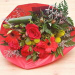 rosas rojas - 6 шт. декоративная зелень - 5 шт. Красные герберы - 4 шт. красные альстромерии - 3 шт. фуксиевые гвоздики - 3 шт. желтые бутонные хризантемы - 4 шт. белый наполнительный цветок - 3 шт.