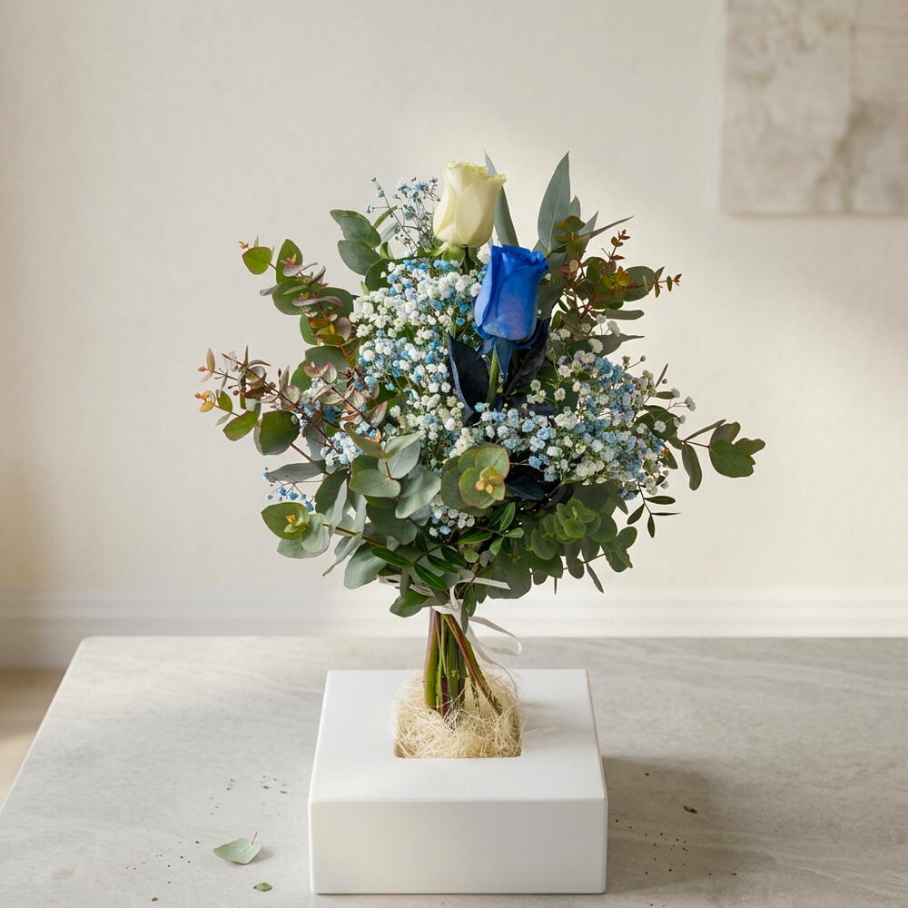 белая роза - 1 шт. разнообразная зелень - 7 шт. синяя паникулата - 5 шт. синяя роза - 1 шт.