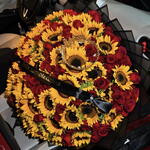 rosas rojas - 50 шт. подсолнухи - 30 шт. бант из ленты - 1 шт. корейская бумага - 1 шт. персонализированная лента - 1 шт.