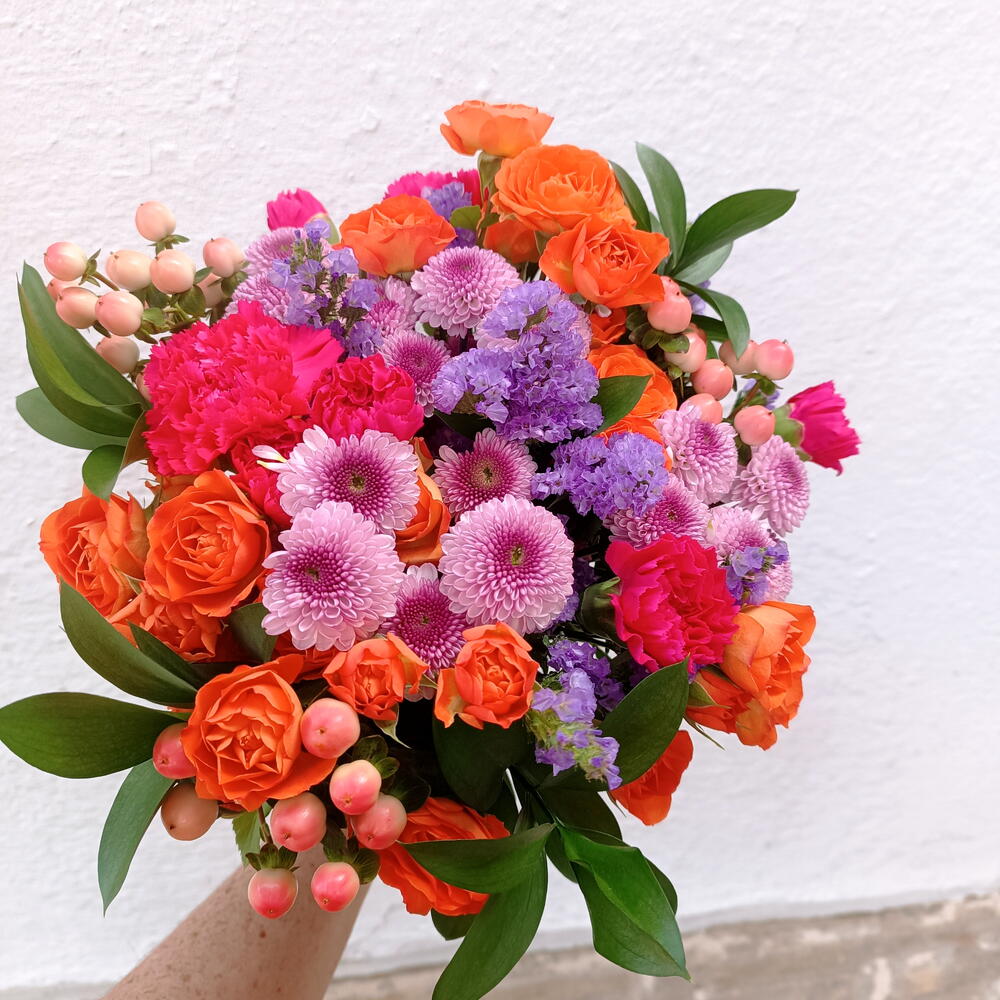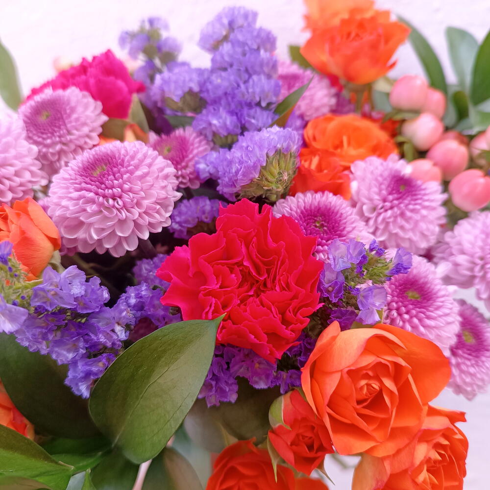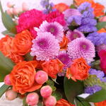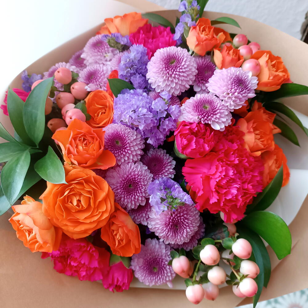Букет «Индира» сияющий и эклектичный. Он составлен из разнообразных сезонных цветов сиреневых и оранжевых оттенков. (Цветы могут отличаться по цвету, размеру и форме в зависимости от природных и сезонных факторов. Изображение представлено в качестве иллюстрации; окончательная композиция будет очень похожа, но зависит от сезонной доступности цветов.)