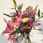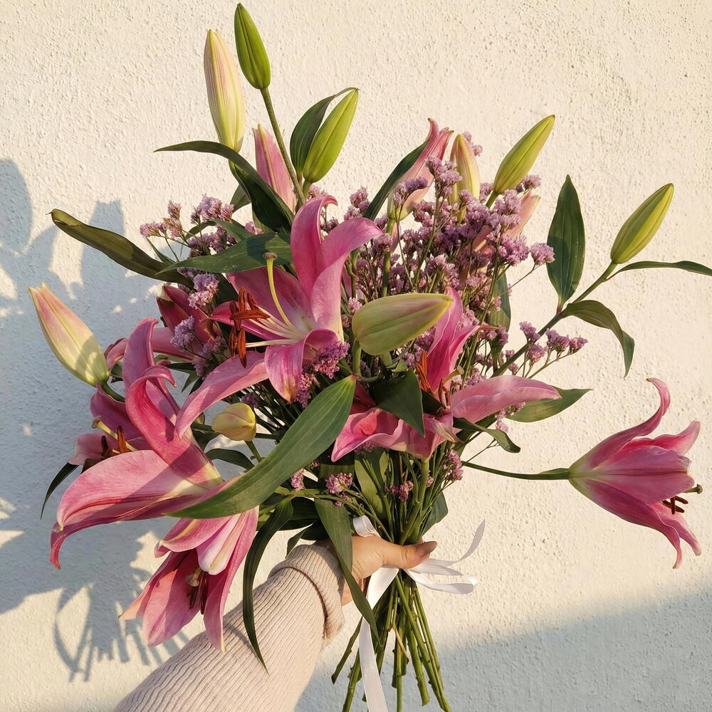 Букет ориентальных лилий — это изысканная и ароматная флористическая композиция, идеальная для подарка по особым случаям, таким как дни рождения, годовщины, благодарности или просто чтобы удивить элегантным жестом. Этот букет сочетает крупные розовые ориентальные лилии с деликатным лимониумом и свежим эвкалиптом, создавая сбалансированную, современную и очень декоративную композицию. Ориентальные лилии выделяются интенсивным ароматом и экзотическим видом, превращая этот букет в очень востребованный вариант по запросам вроде «букет ориентальных лилий», «букет розовых лилий», «ароматные цветы», «элегантный букет для подарка» и «премиальные цветы».