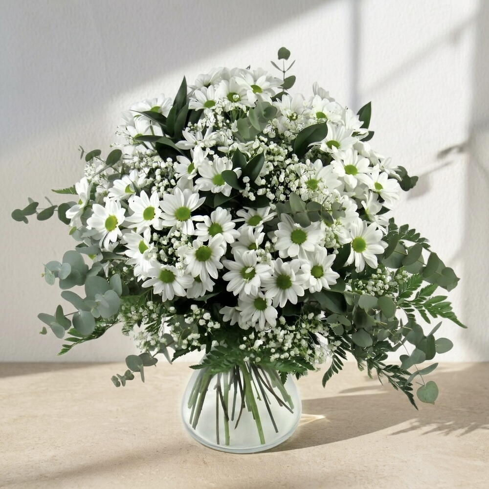 Букет белых ромашек с зеленью. Откройте для себя естественную элегантность этого прекрасного букета белых ромашек в сочетании с декоративной зеленью и гипсофилой, которые придают букету романтическую и свежую нотку. Идеально подходит для дней рождения, благодарственных писем, юбилеев или просто для того, чтобы поднять кому-то настроение. Его изящный стиль передает умиротворение, нежность и гармонию. Букет идеально подходит для любого случая, создавая ощущение естественности и изысканности. Инструкция по уходу: Поставьте букет в вазу со свежей водой сразу после получения. Меняйте воду каждые два дня и слегка подрежьте стебли по диагонали для лучшего впитывания воды. Избегайте прямого попадания солнечных лучей и тепла. Соблюдая эти рекомендации по уходу, ваши ромашки будут сиять дольше.