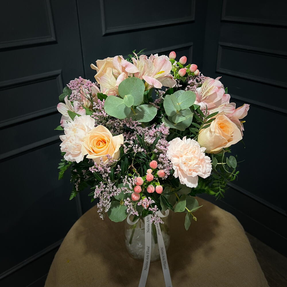 Нежный персиковый букет из роз, гвоздик, зверобоя и альстромерий. Откройте для себя тепло персикового букета от Nerine Arte Floral — композиции ручной работы, призванной передать нежность и радость. Этот эксклюзивный дизайн сочетает в себе элегантность роз с дикой текстурой зверобоя, нежную красоту альстромерий и классический оттенок гвоздик, гармонично дополненные тонким ароматом лимониума. Лососевая и персиковая цветовая палитра делает этот букет идеальным выбором для подарка на день рождения, благодарственного письма или просто для того, чтобы украсить свой дом особым шармом.