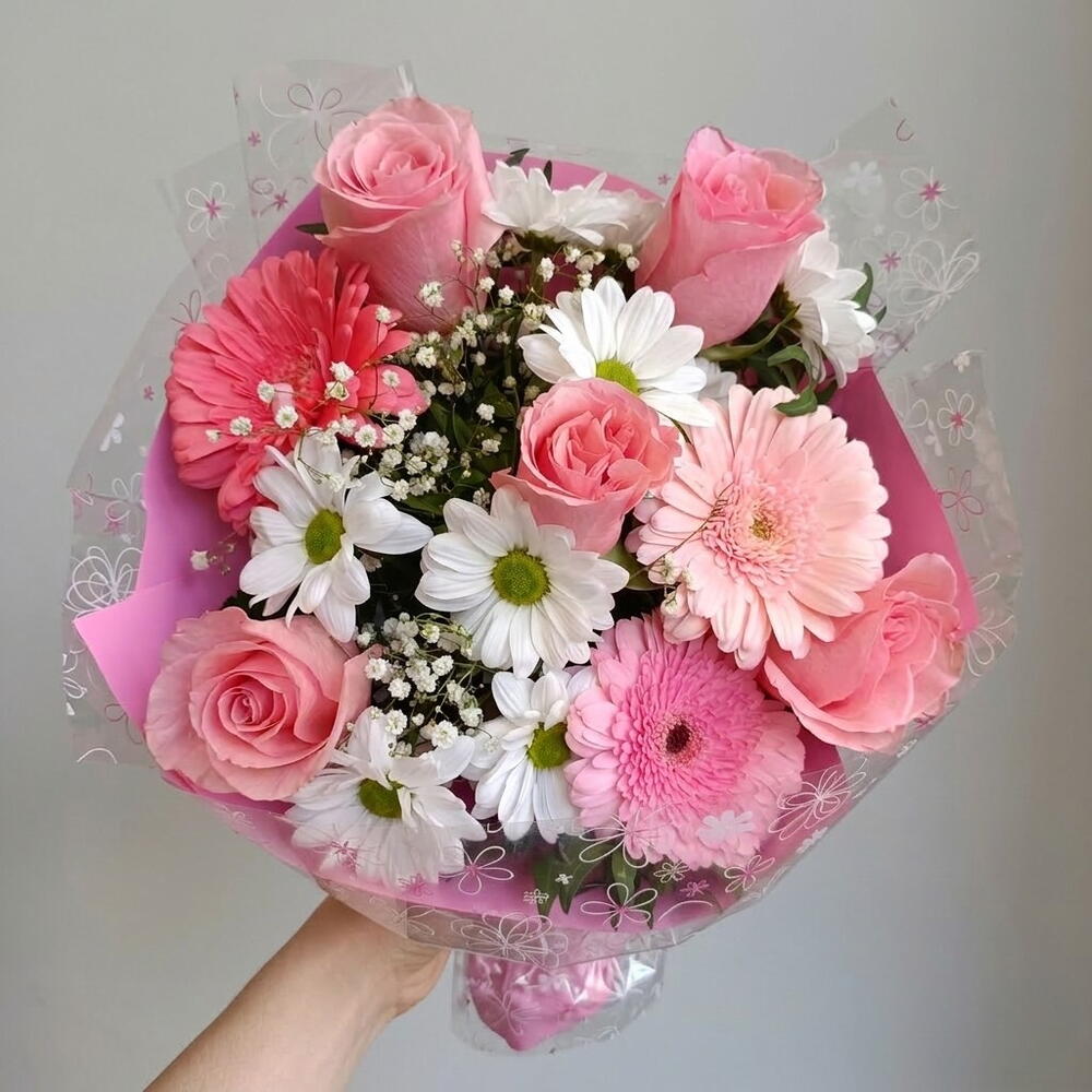 Откройте для себя вневременную красоту с нашим классическим букетом — элегантным сочетанием из 4 гербер, 2 ромашек и 5 розовых роз. Украшенный двумя белыми гипсофилами, этот букет идеально подходит для выражения самых чистых и искренних чувств. Будь то день рождения, годовщина или просто желание поднять кому-то настроение, этот классический букет никогда не выйдет из моды и всегда оставит неизгладимое впечатление.