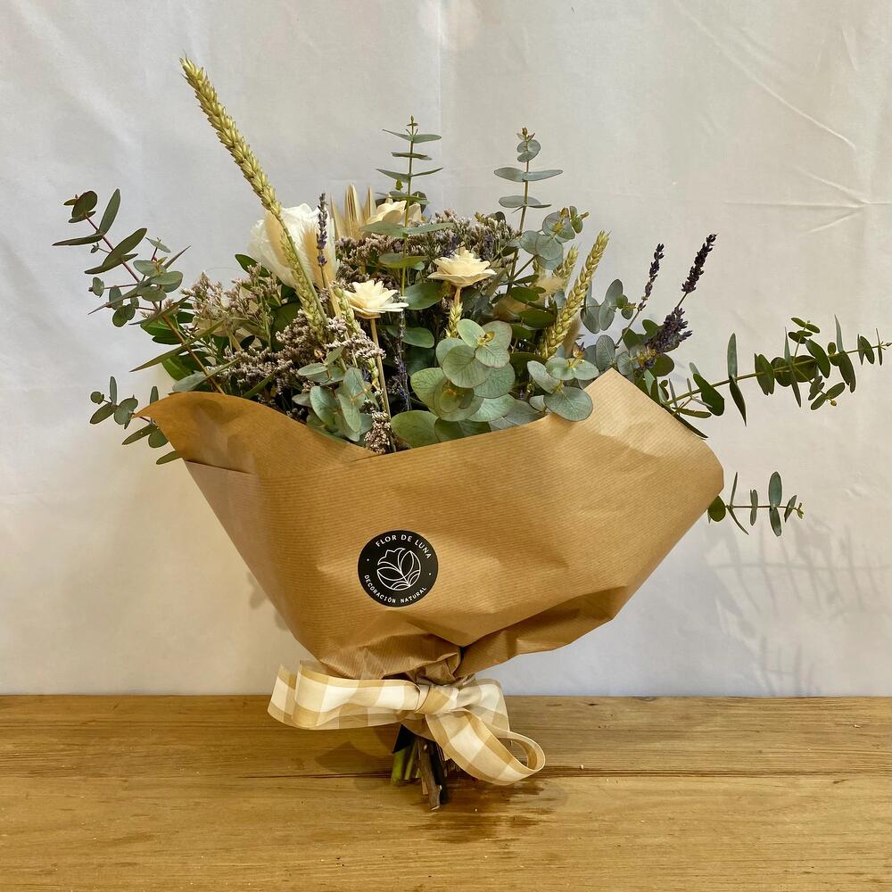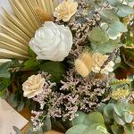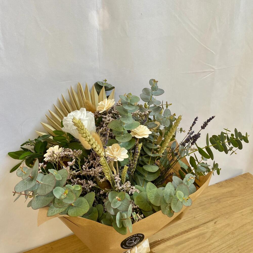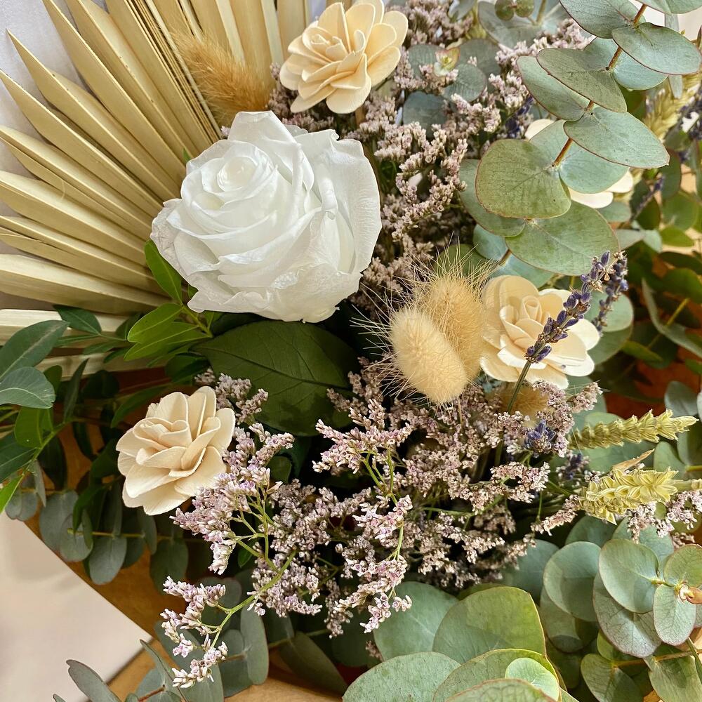 eucalipto - 15 шт. лентиск - 1 шт. пшеница - 6 шт. лимониум мальва - 8 шт. лист пальмы - 1 шт. лагурус натуральный - 3 шт. белая стабилизированная роза - 1 шт. деревянные цветы - 3 шт. натуральная лаванда - 3 шт.