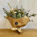 Букет из сушеных и стабилизированных цветов, состоящий из мастики, серого эвкалипта, стабилизированной белой розы, лимониума мальвы, цветков кедра, натурального лагуруса, пшеницы, пальмового листа и натуральной лаванды. Размеры букета: диаметр 50 см, высота 60 см.