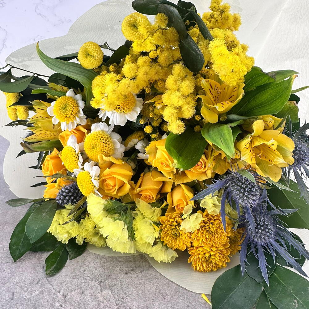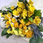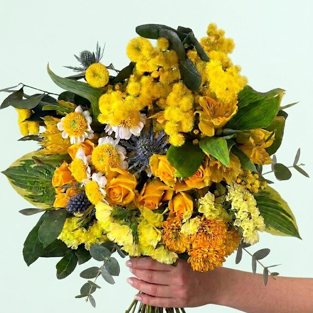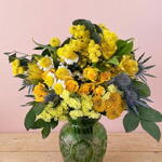 Букет «Сол» идеально подходит для подарка, украшения дома или офиса. Он элегантный и сияющий. Он составлен из разнообразных сезонных цветов желтых и зеленых оттенков. (Цветы могут отличаться по цвету, размеру и форме из-за природных и сезонных факторов. Изображение представлено в качестве иллюстрации; окончательная композиция будет очень похожа, но зависит от наличия цветов в каждом сезоне.)