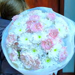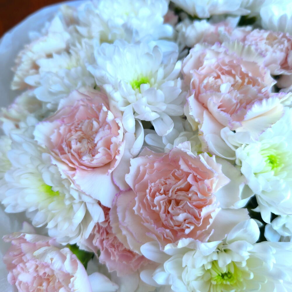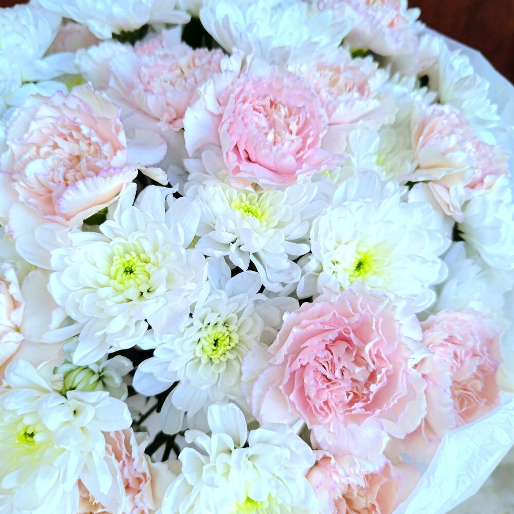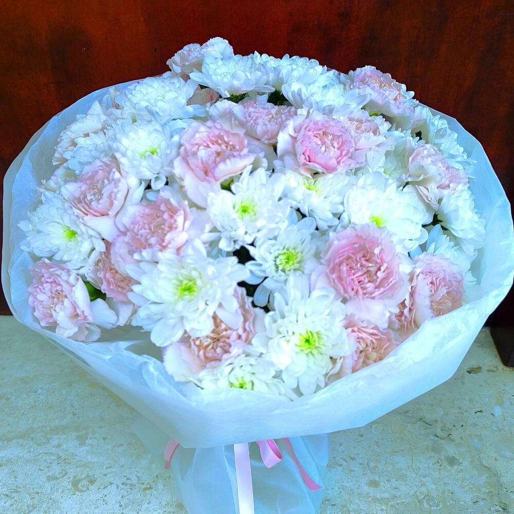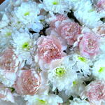 Ramo blanco y rosa delicado para ella. Crisantemos y claveles en tonos suaves que transmiten ternura, armonía y cariño. Un detalle perfecto para cualquier ocasión.