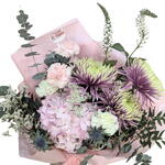 Букет с розовой гортензией, анастасиями, гвоздиками и другими цветами.