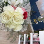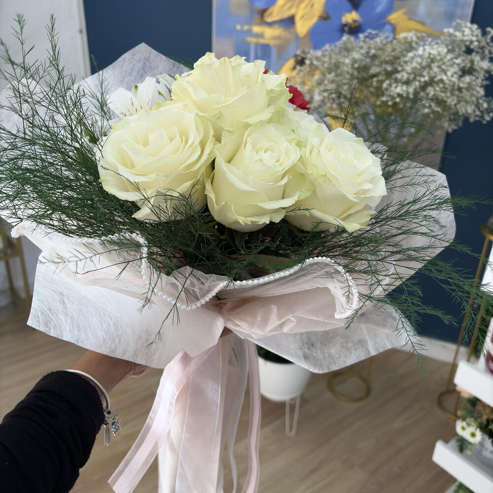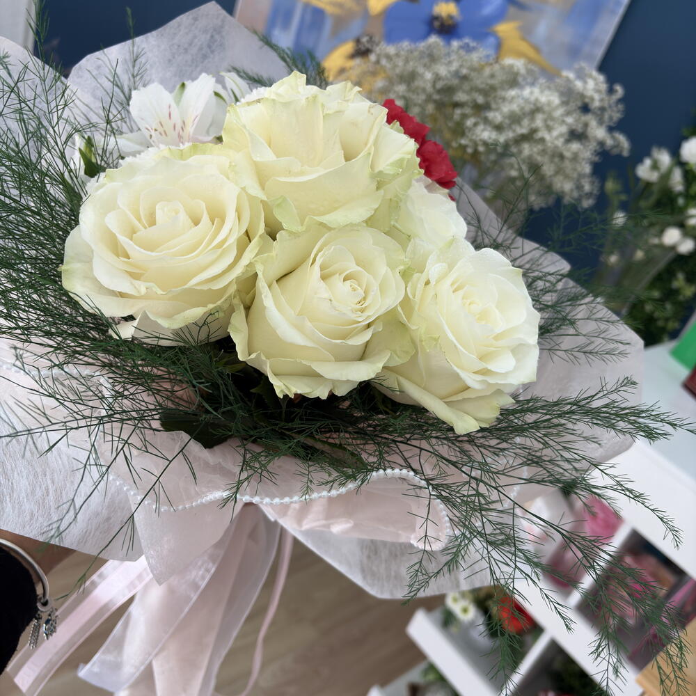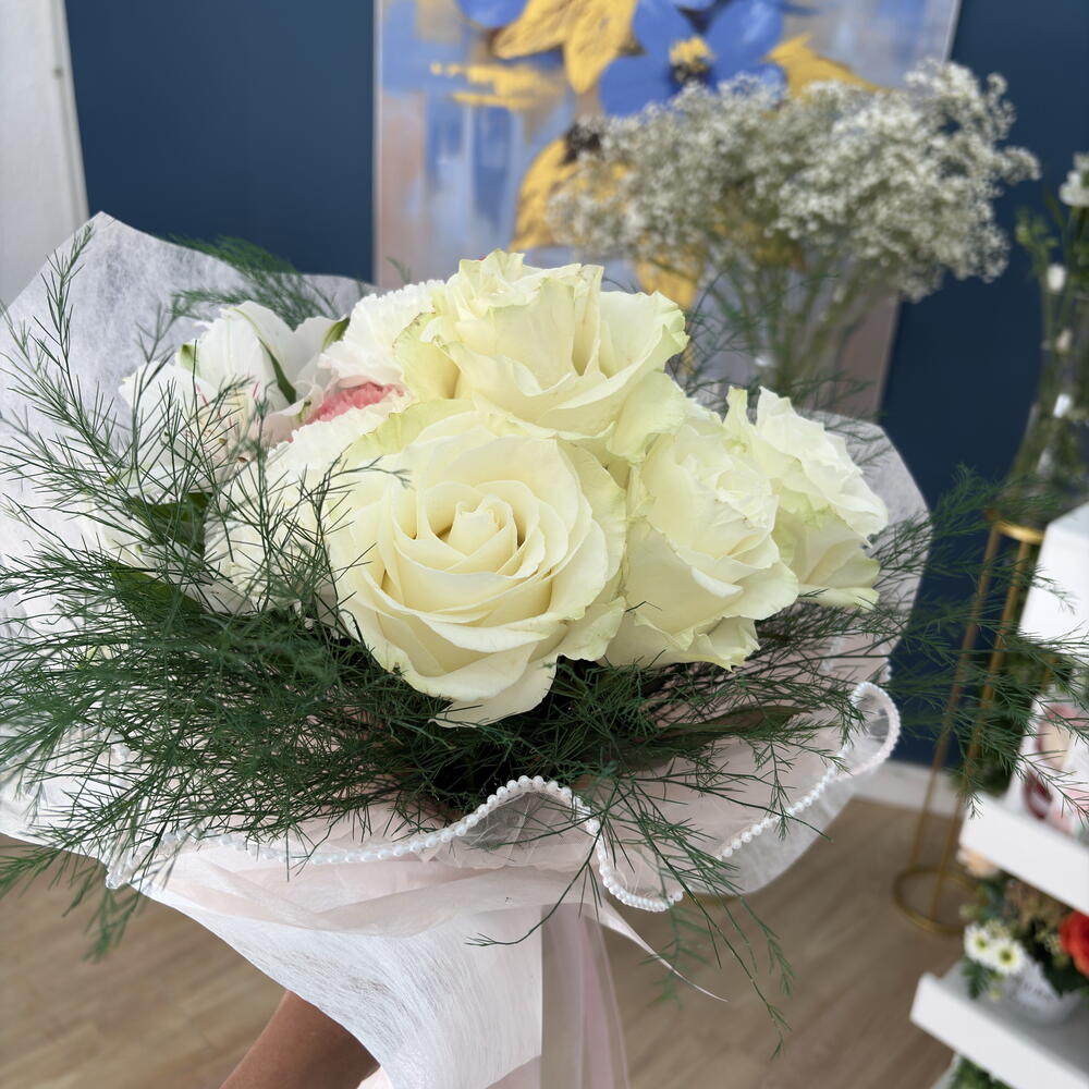 gypsofilia - 2 шт. роза белая или розовая mondial - 4 шт. гвоздика белая или розовая - 4 шт. альстромерия или лилии - 3 шт. белая бумага тишью - 3 шт. органза с жемчужинами белая или розовая - 1 шт. зелёный аспарагус - 3 шт.