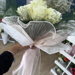 Прекрасный нежный и мягкий букет, созданный из белых или розовых роз лучшего качества и с нежной отделкой из бумаги тишью и органзы с жемчужинами