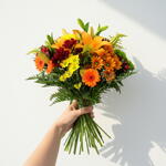 Этот исключительный авторский букет состоит из ослепительных лилиумов оранжево/жёлтого цвета, нежных альстромерий, с добавлением ярких маргариток, а также украшен наполнителями и зеленью. Это зрелище красок и ароматов, которое идеально доставит удовольствие чувствам и станет отличным подарком по бесчисленным поводам.